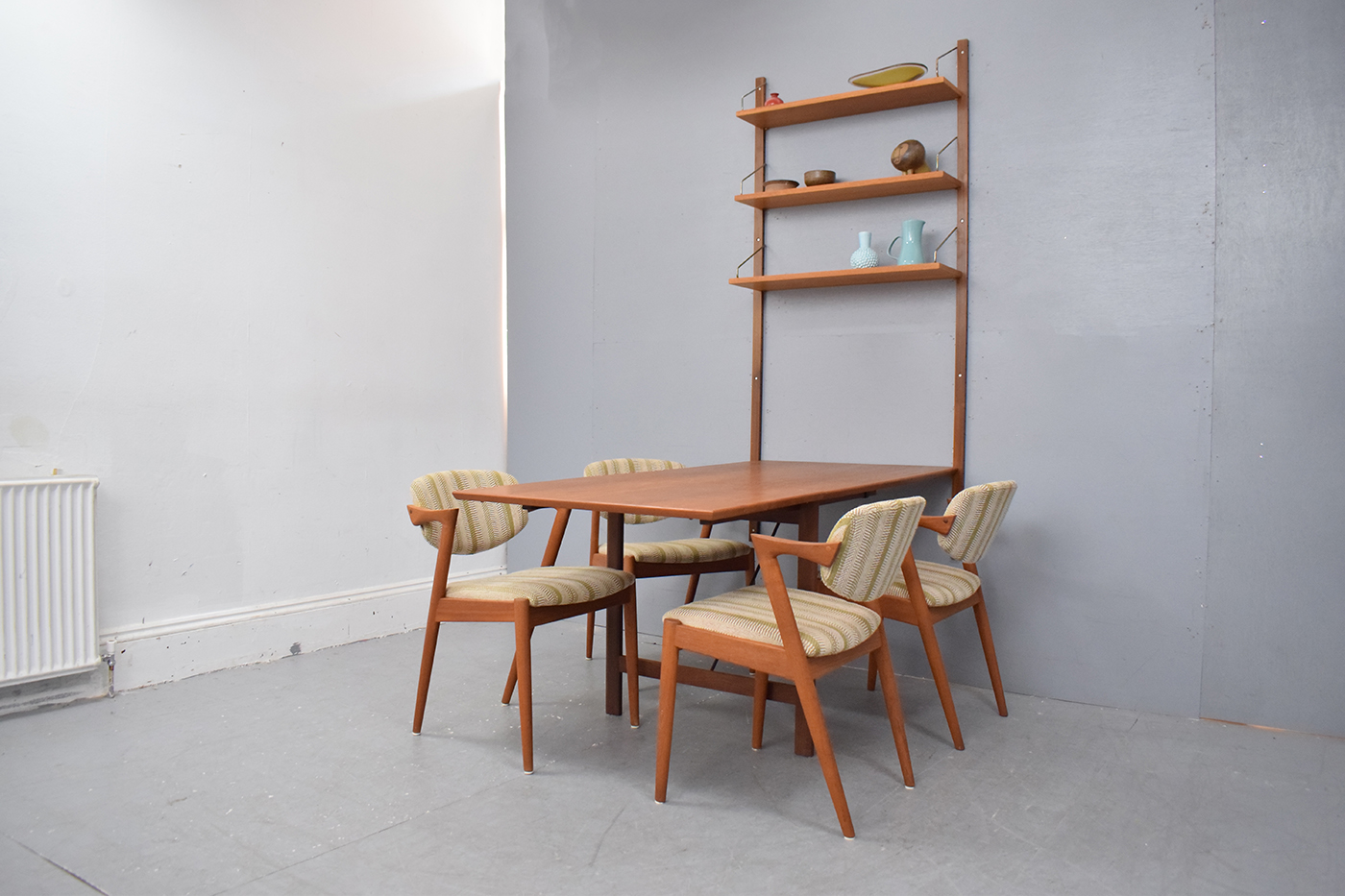 This drop-leaf dining table is a rare option that you could order as part of the ROYAL system functions and was designed so the maximum use of wall and floor space could be acheived without compromising one for the other.
