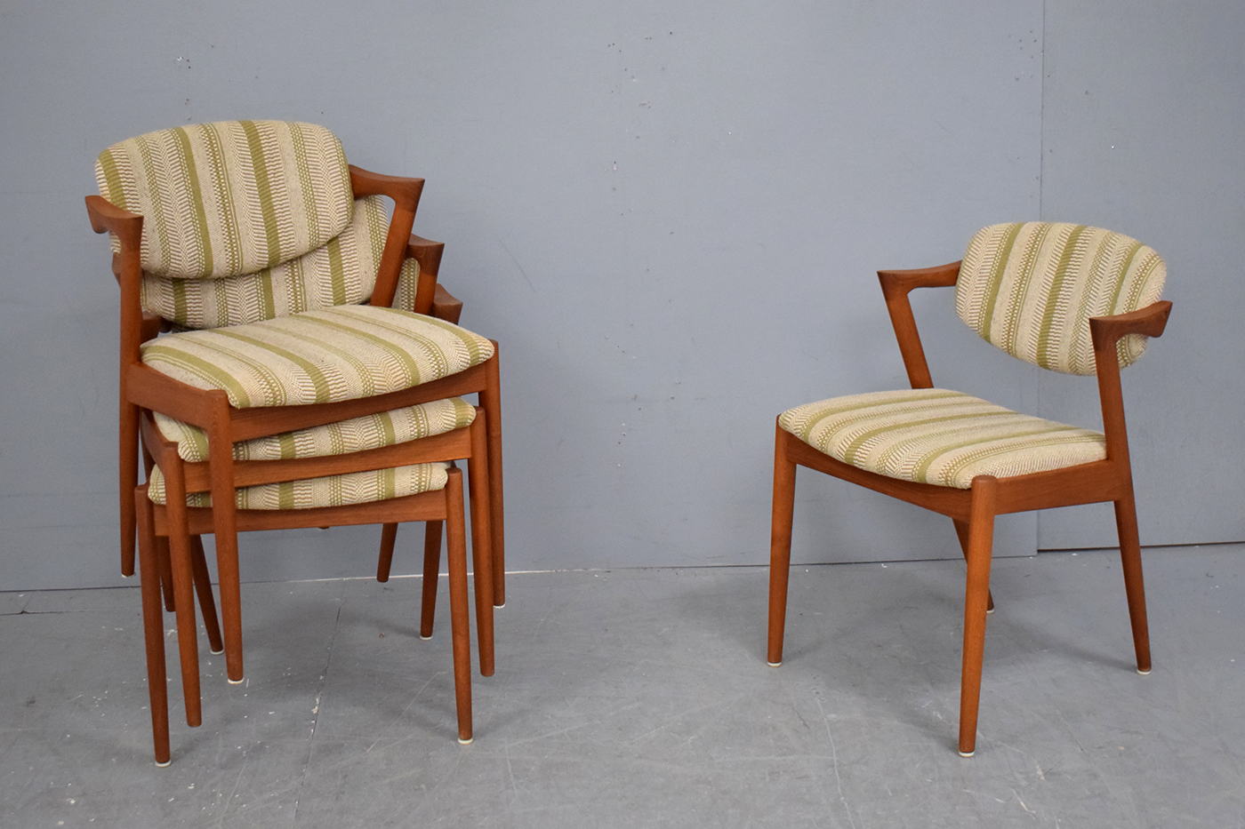 This set of 4 vintage Kai Kristiansen Model 42 dining chairs feature angular teak frames with stunning warm vintage patina.