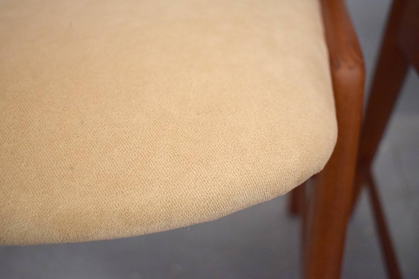 The full set has been recently reupholstered to a warm cream tone fabric that is soft to the touch and provides a nice contrast to the rich vintage teak frames.