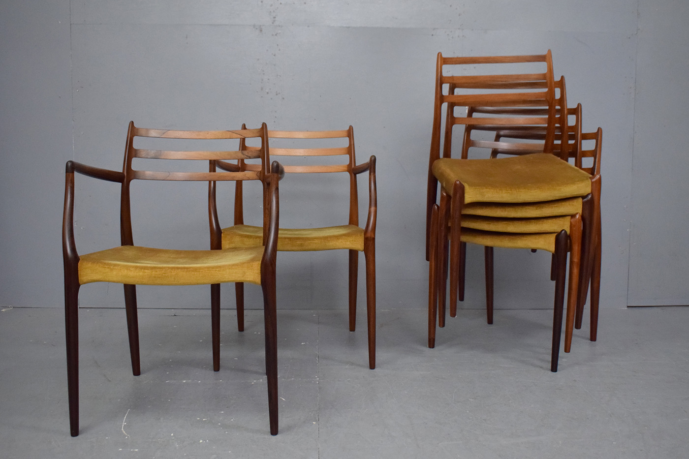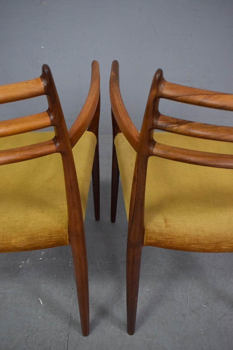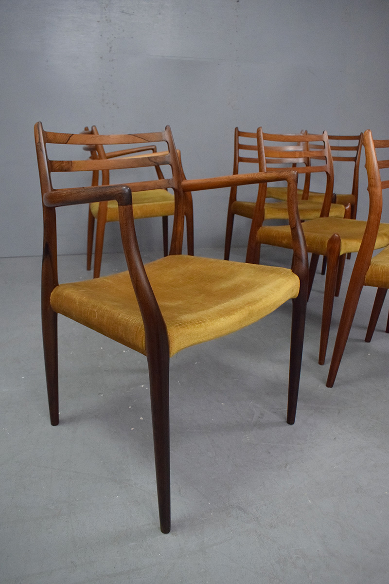 Vintage rosewood framed set of dining chairs comprising 4 side chairs with 2 carver armchairs designed by Niels Moller model 78 & 62 produced 1962 by J L Mollers Mobelfabrik.