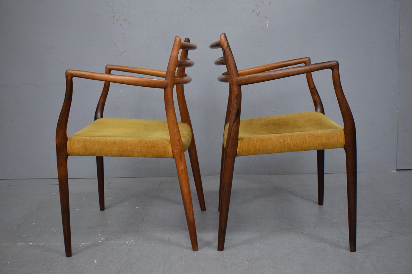 The rosewood frames have been expertly refurbished here at Danish Homestore, and finished with rosewood oil. This nourishes the wood and provides a rich, deep reddish brown colour and maintains the warm patina.
