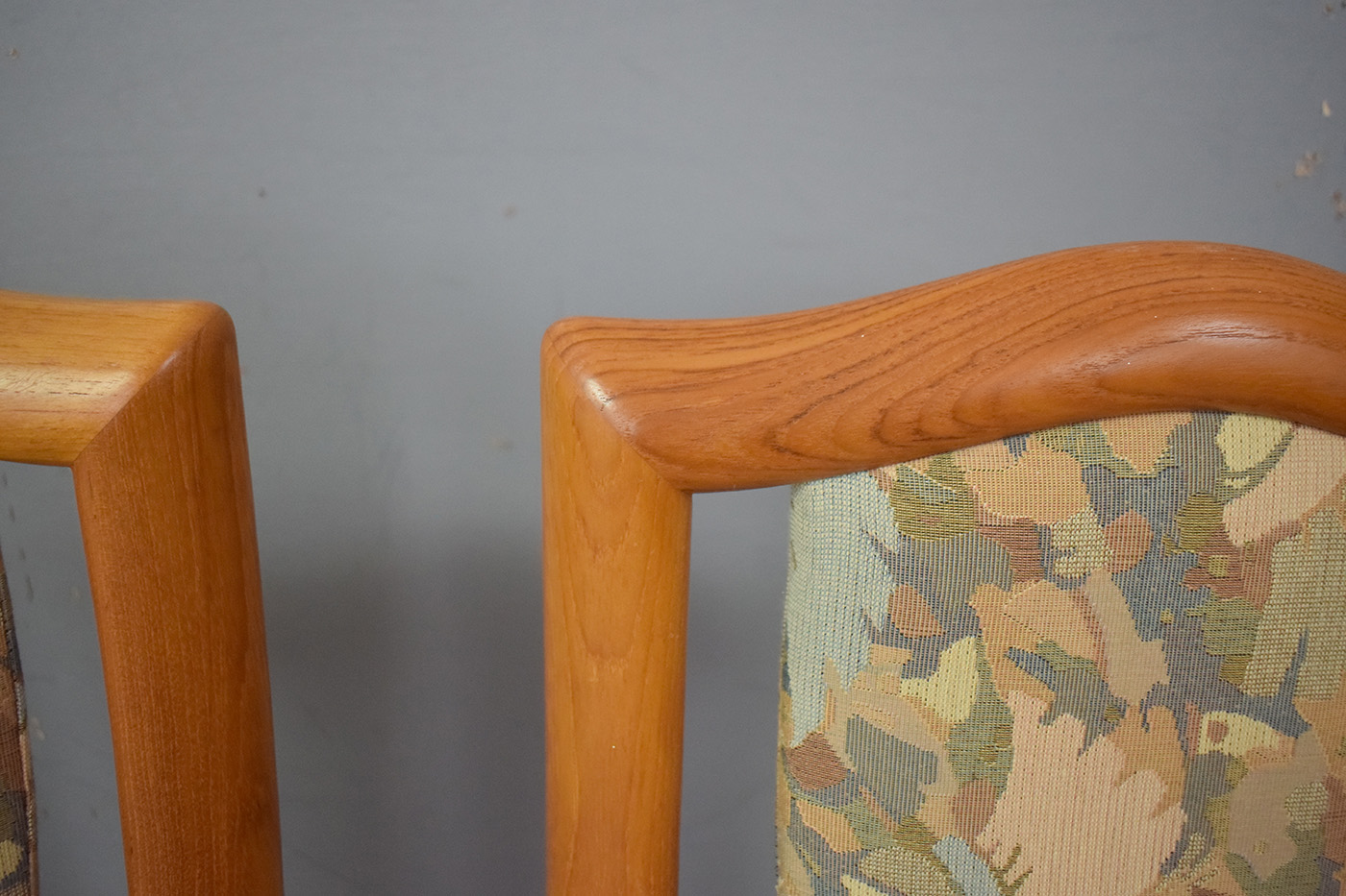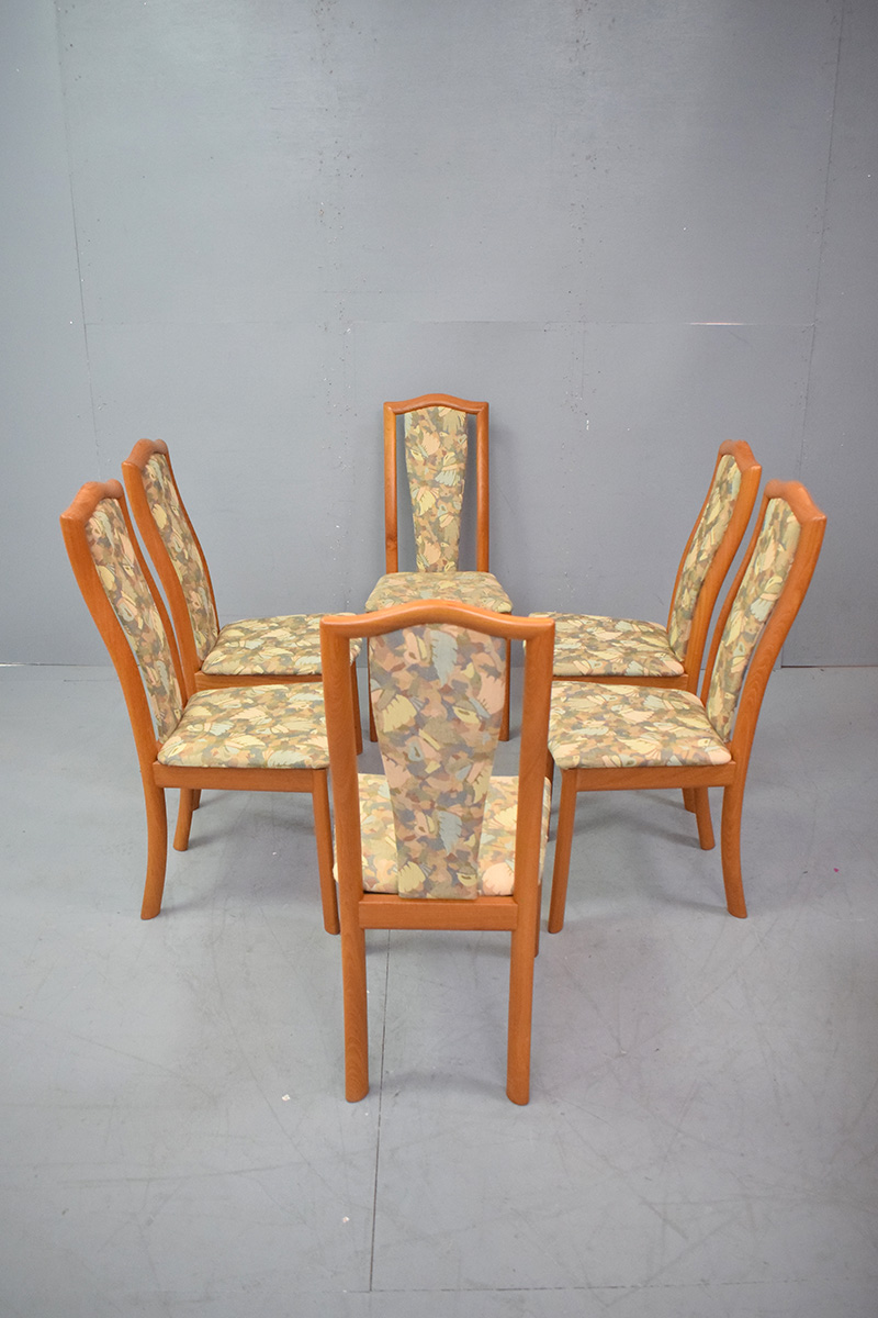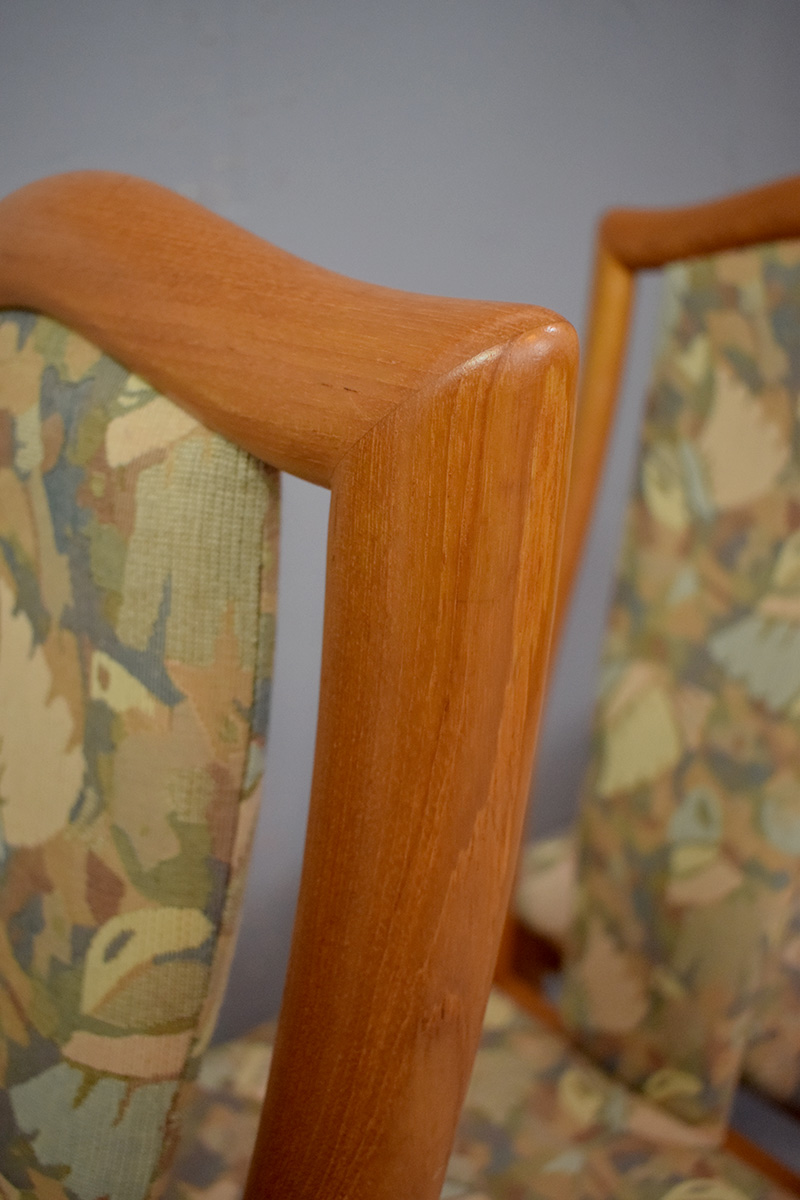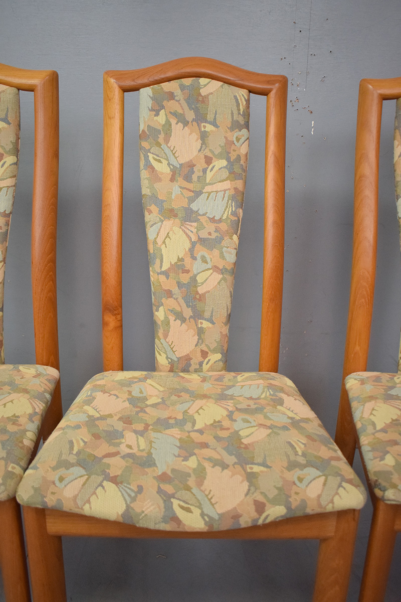 The chairs have the origina Skovby upholstery which is a multi coloured floral pattern. The fabric is clean and unmarked on all chairs.