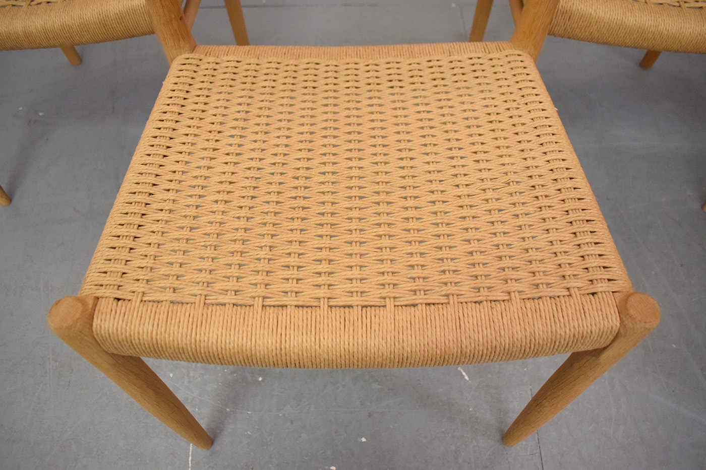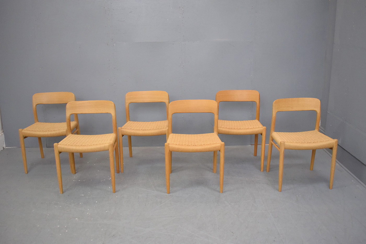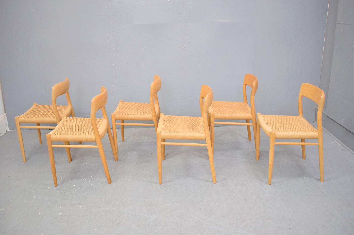 Set of 6 1954 Niels O Moller design dining chairs in light oak with original woven papercord seats - Model 75 by J L Mollers Mobelfabrik.