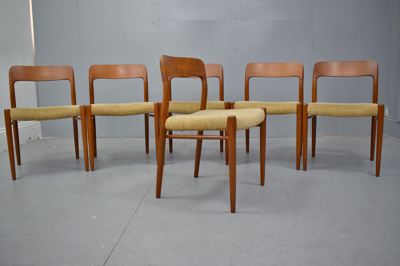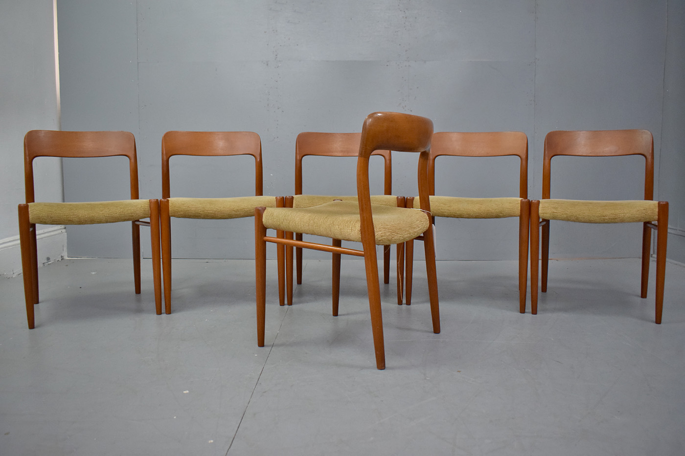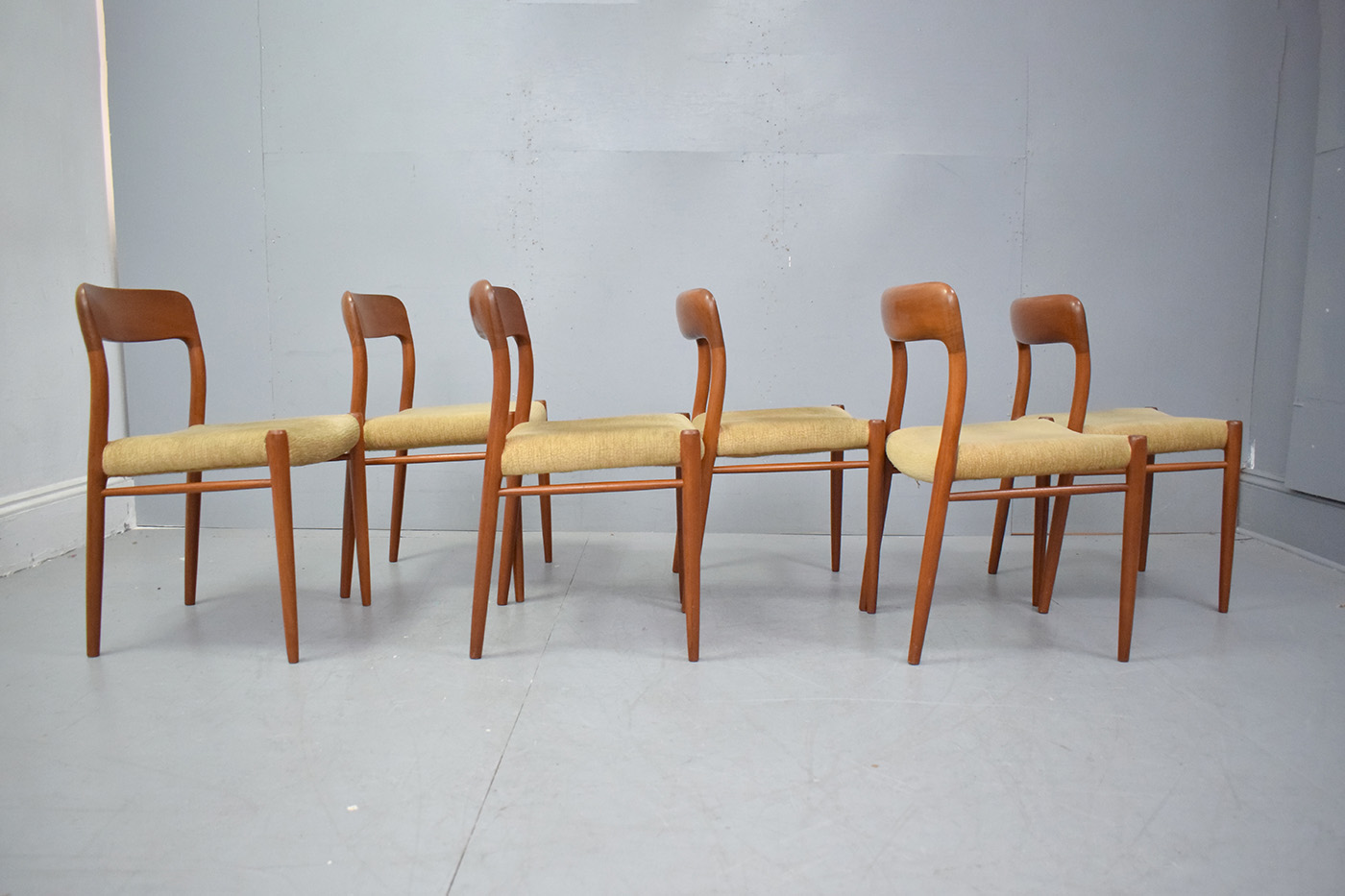 Set of 6 Niels O Moller design dining chairs in vintage teak with beige wool upholstered seats - Model 75 produced 1954 by J L Mollers Mobelfabrik.