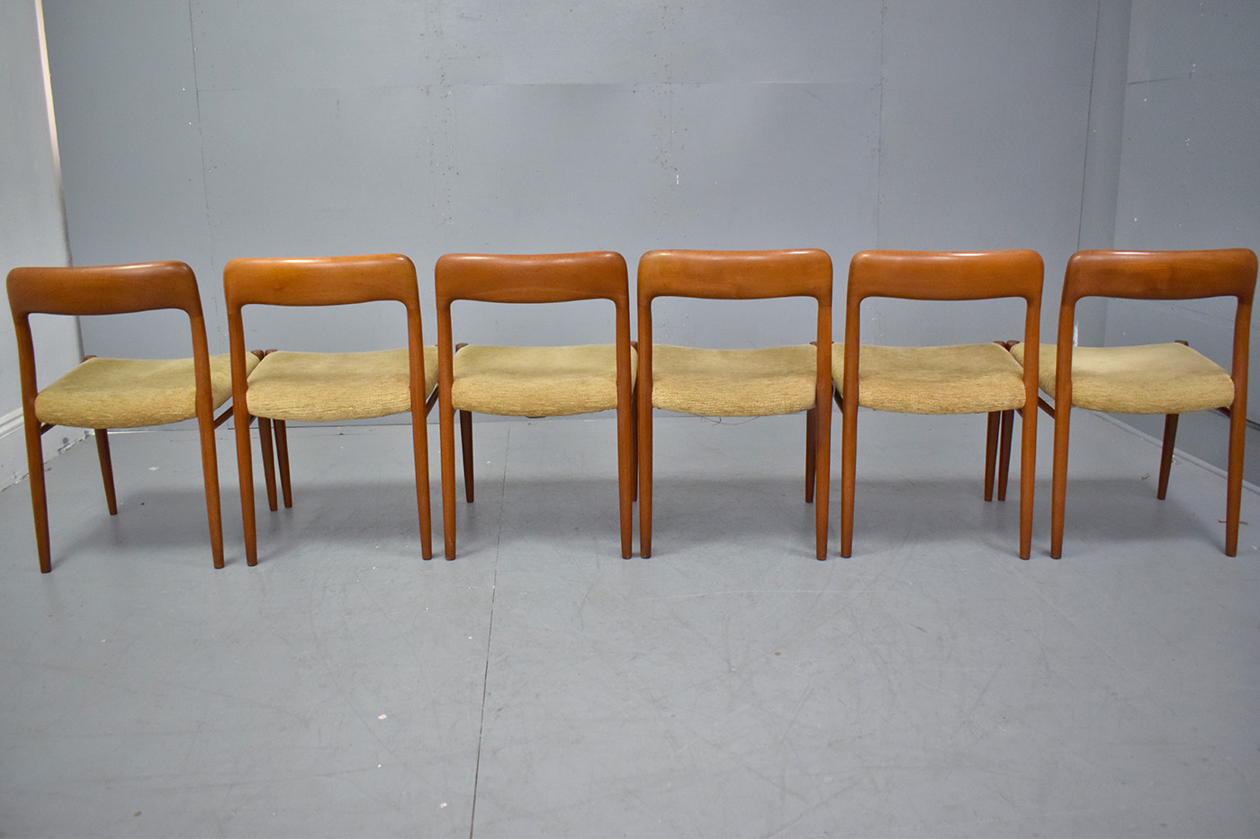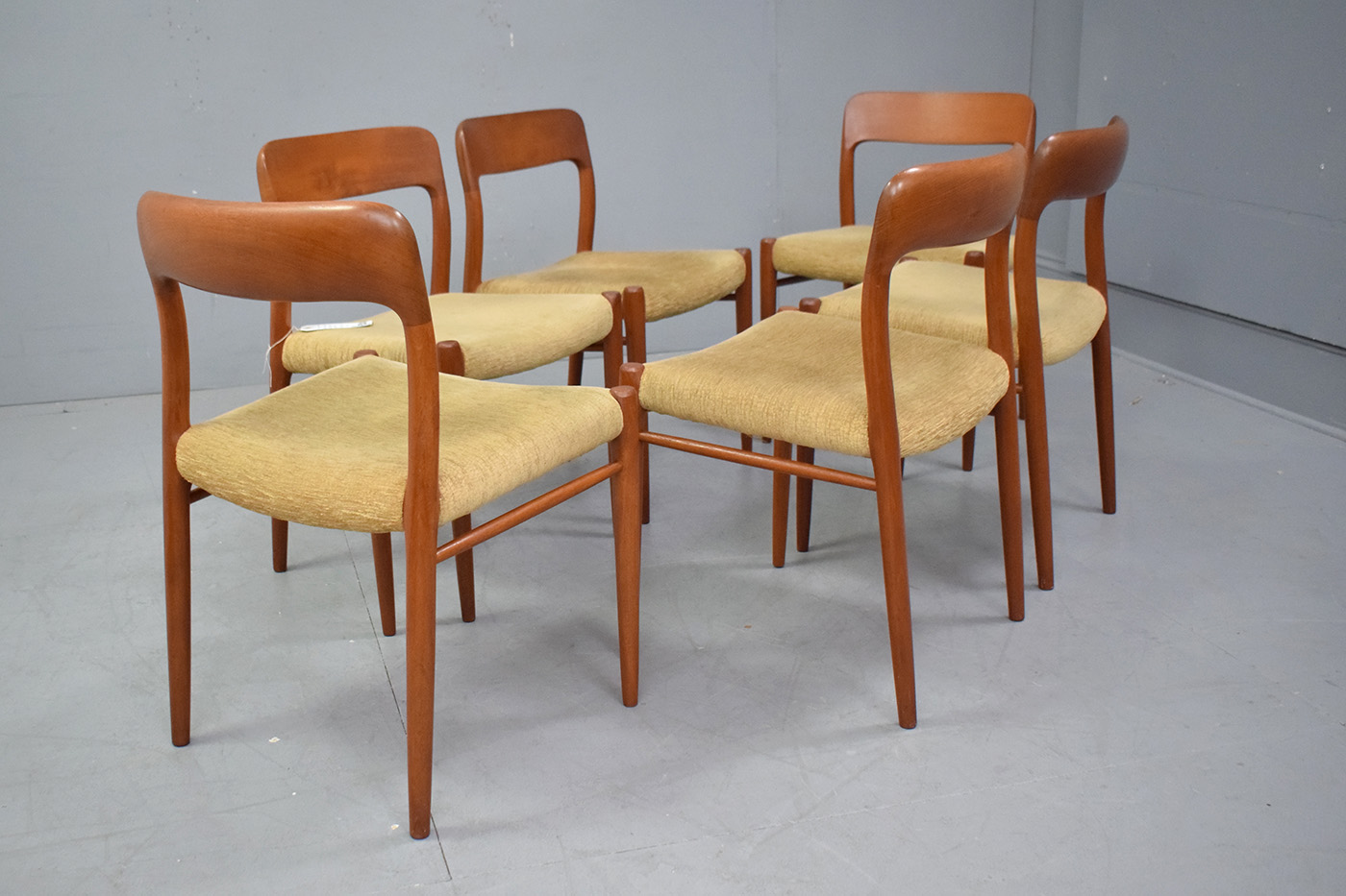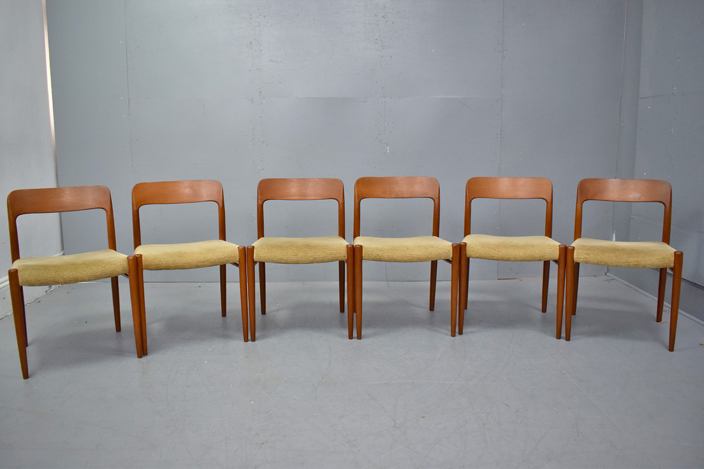 Set of 6 Niels O Moller design dining chairs in vintage teak with beige wool upholstered seats - Model 75 produced 1954 by J L Mollers Mobelfabrik.