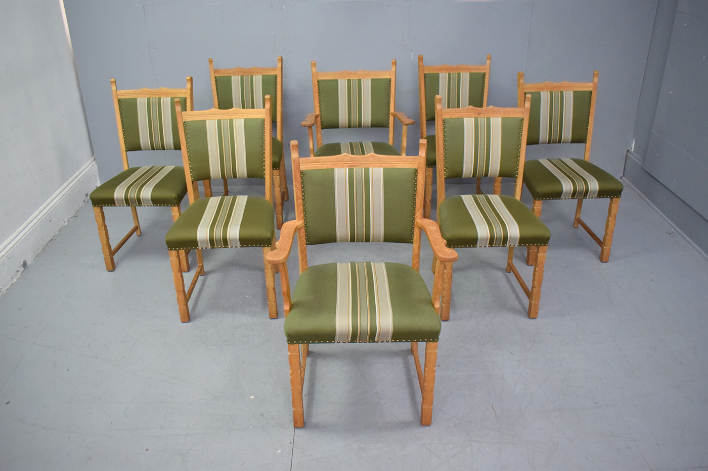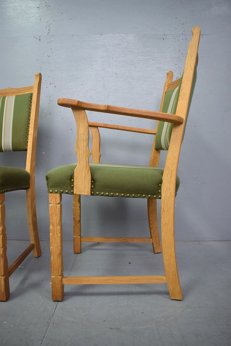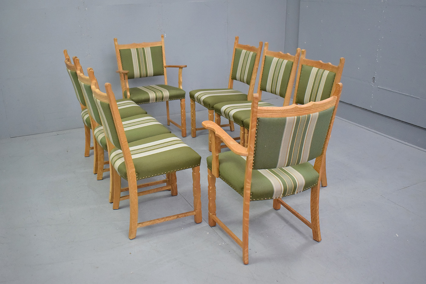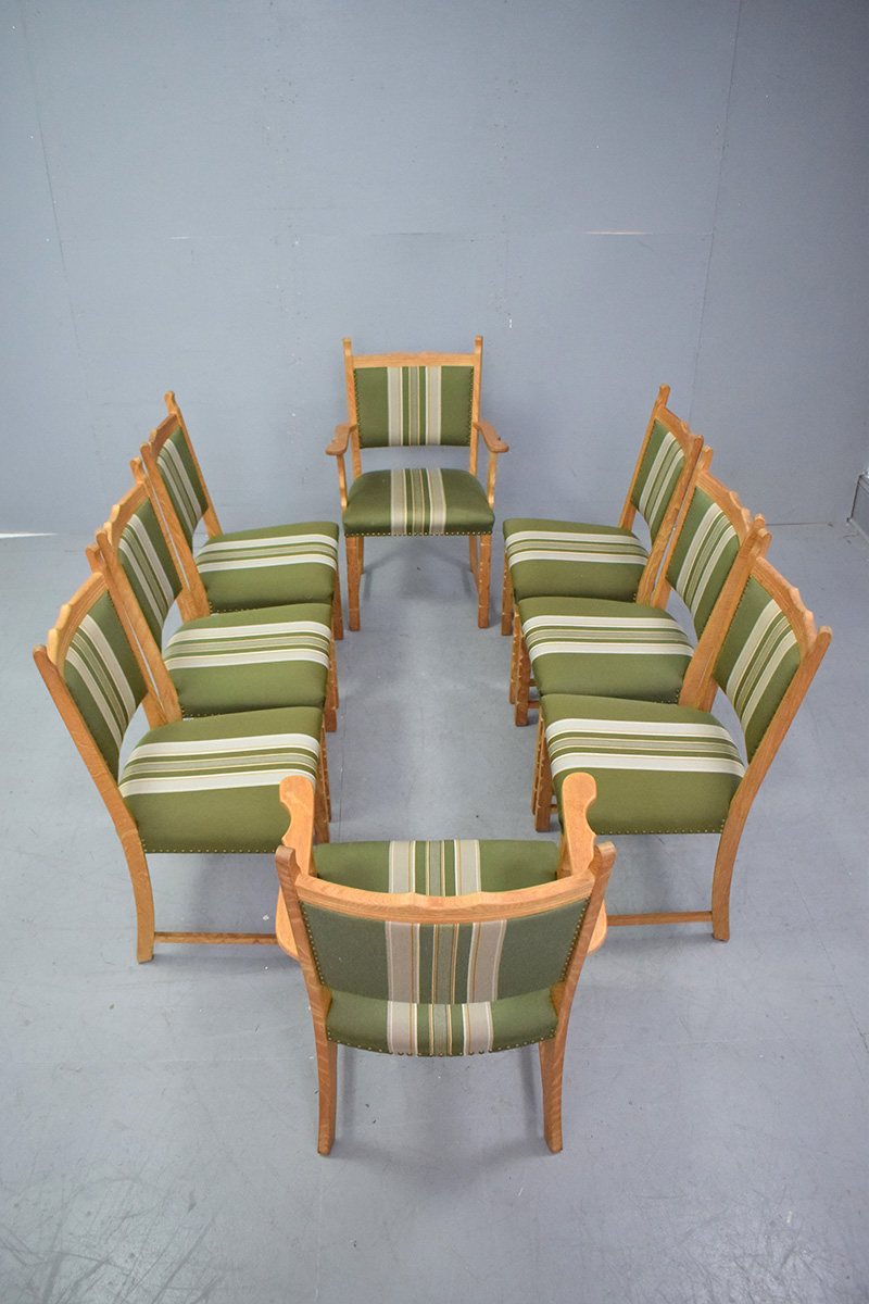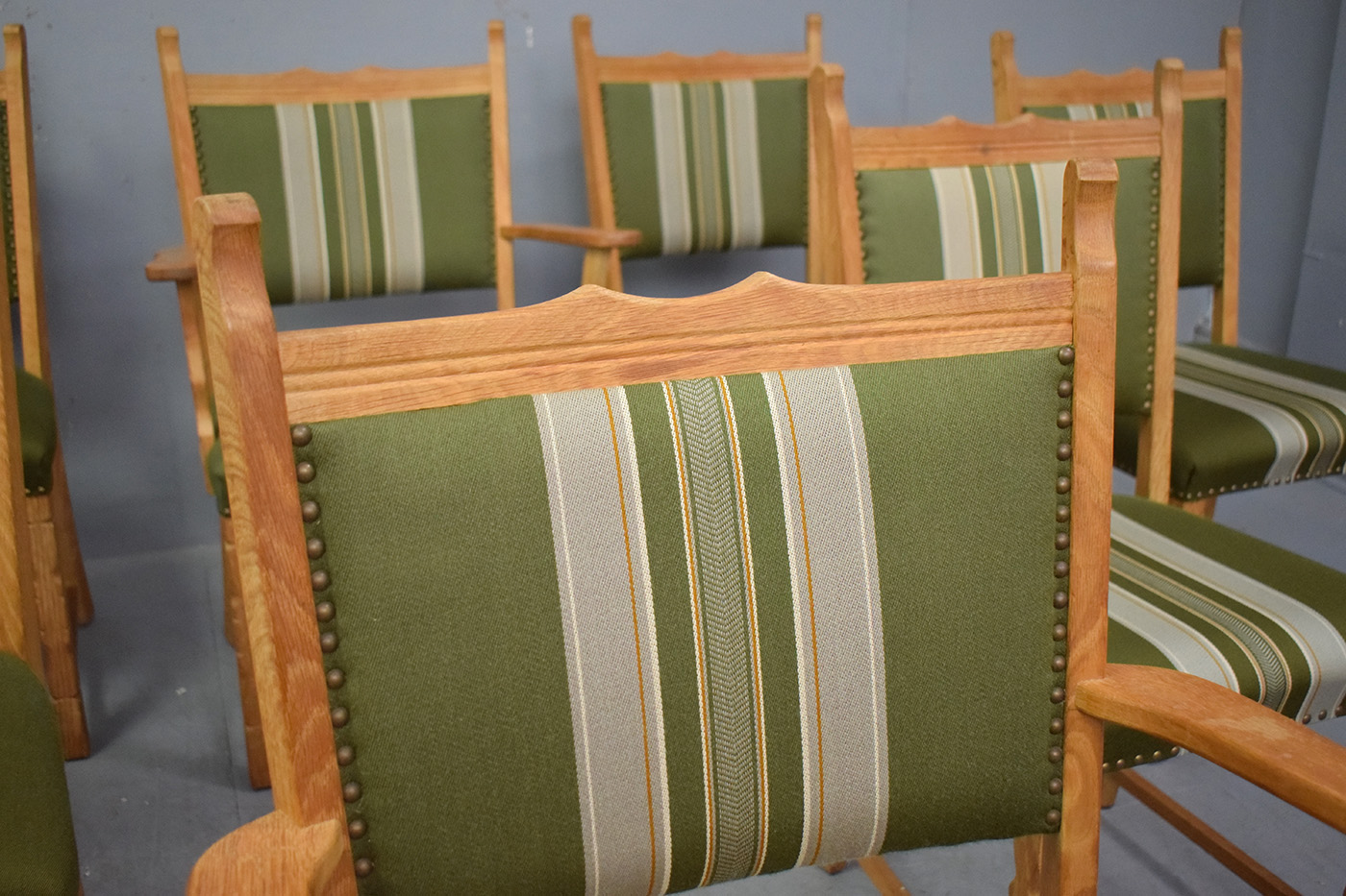 Classic Danish design set of 8 dining chairs, comprising of 2 carvers and 6 side chairs, with green striped wool upholstery.