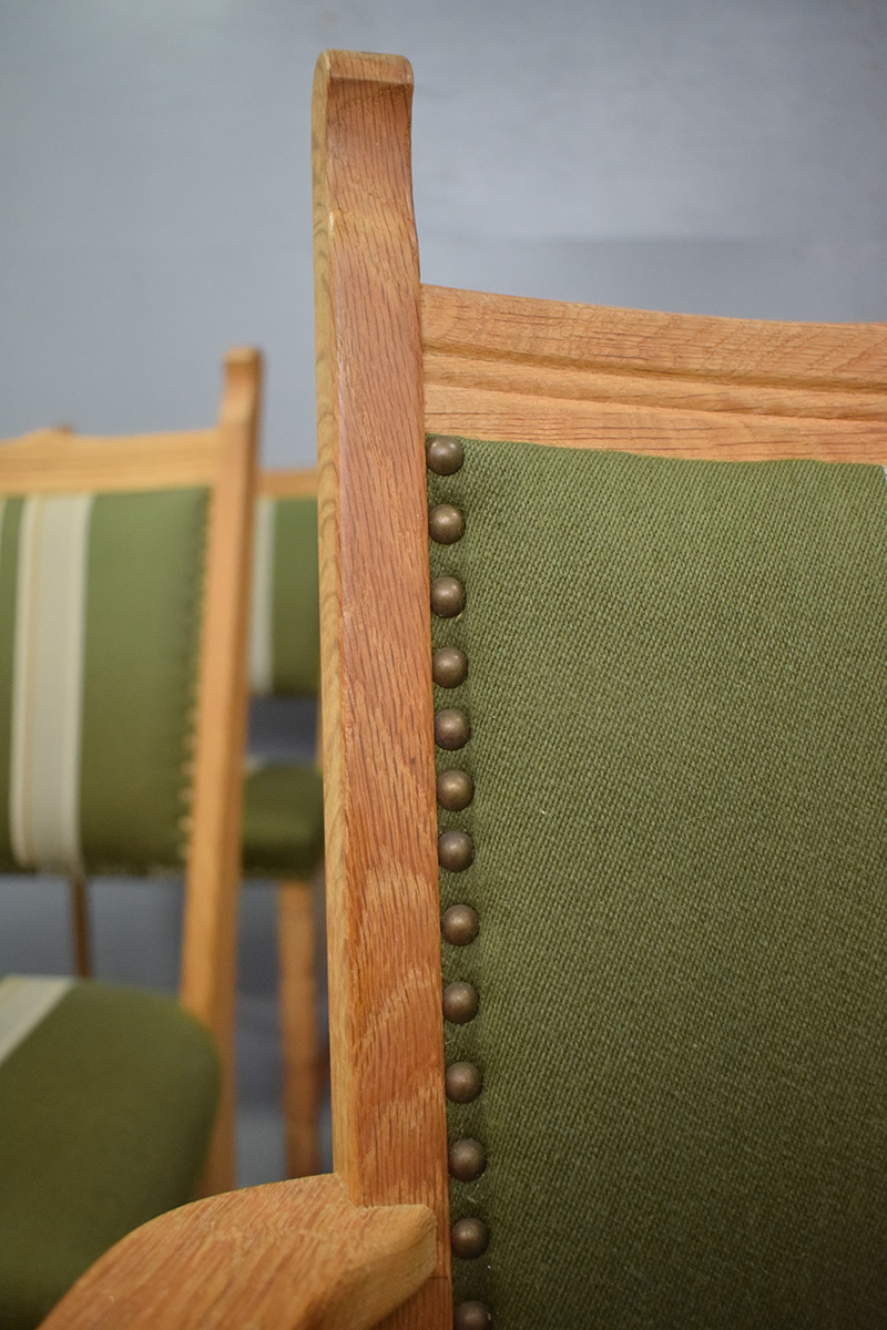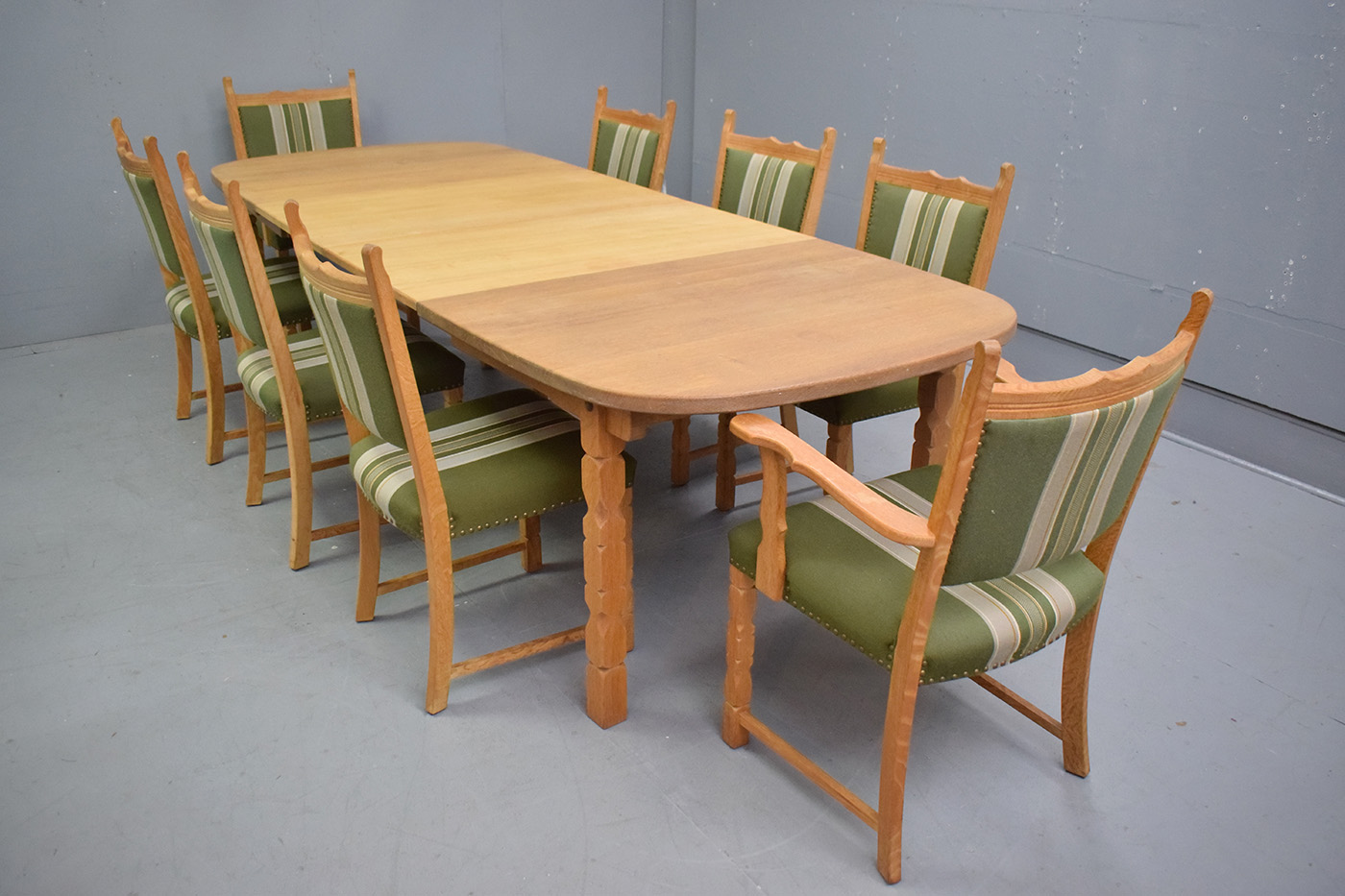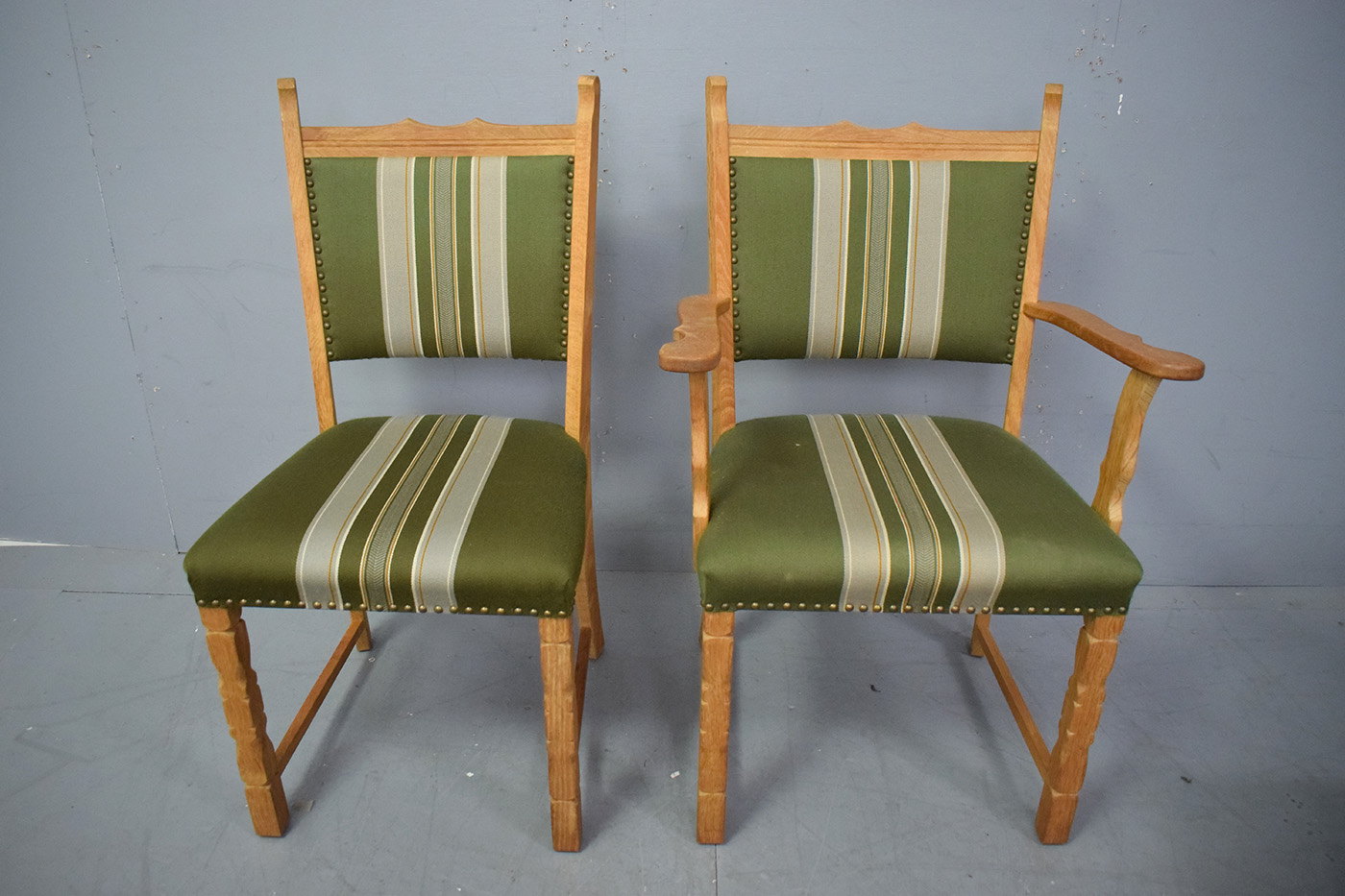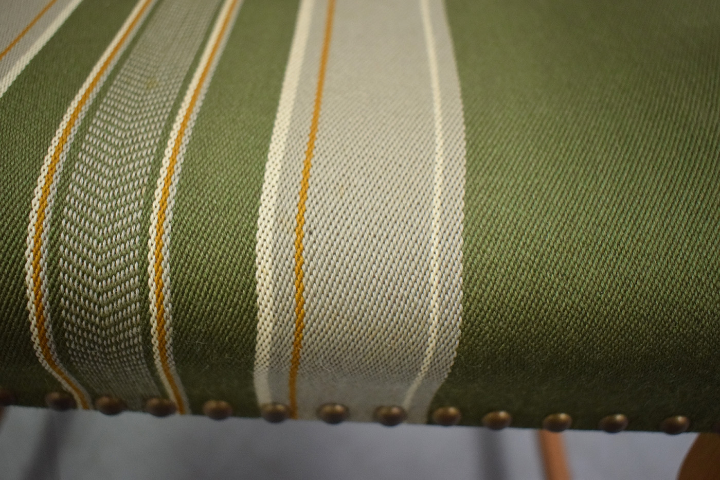 Classic Danish design set of 8 dining chairs, comprising of 2 carvers and 6 side chairs, with green striped wool upholstery.