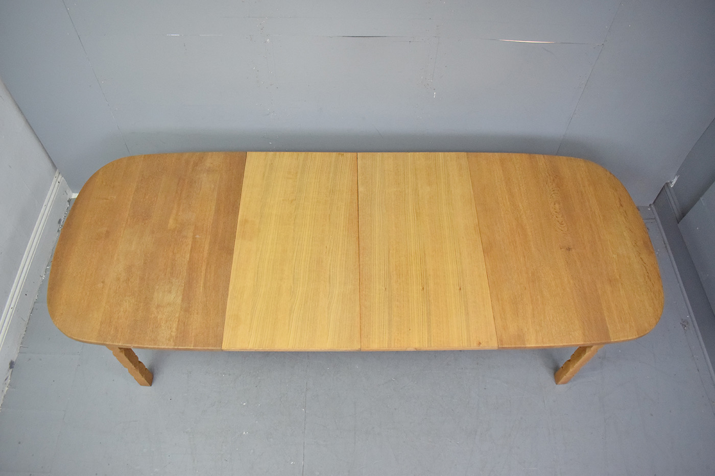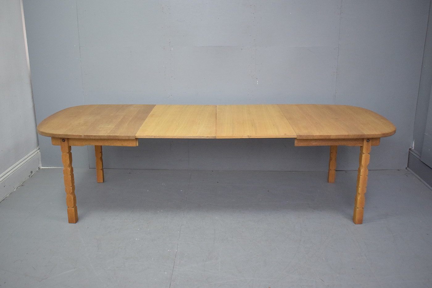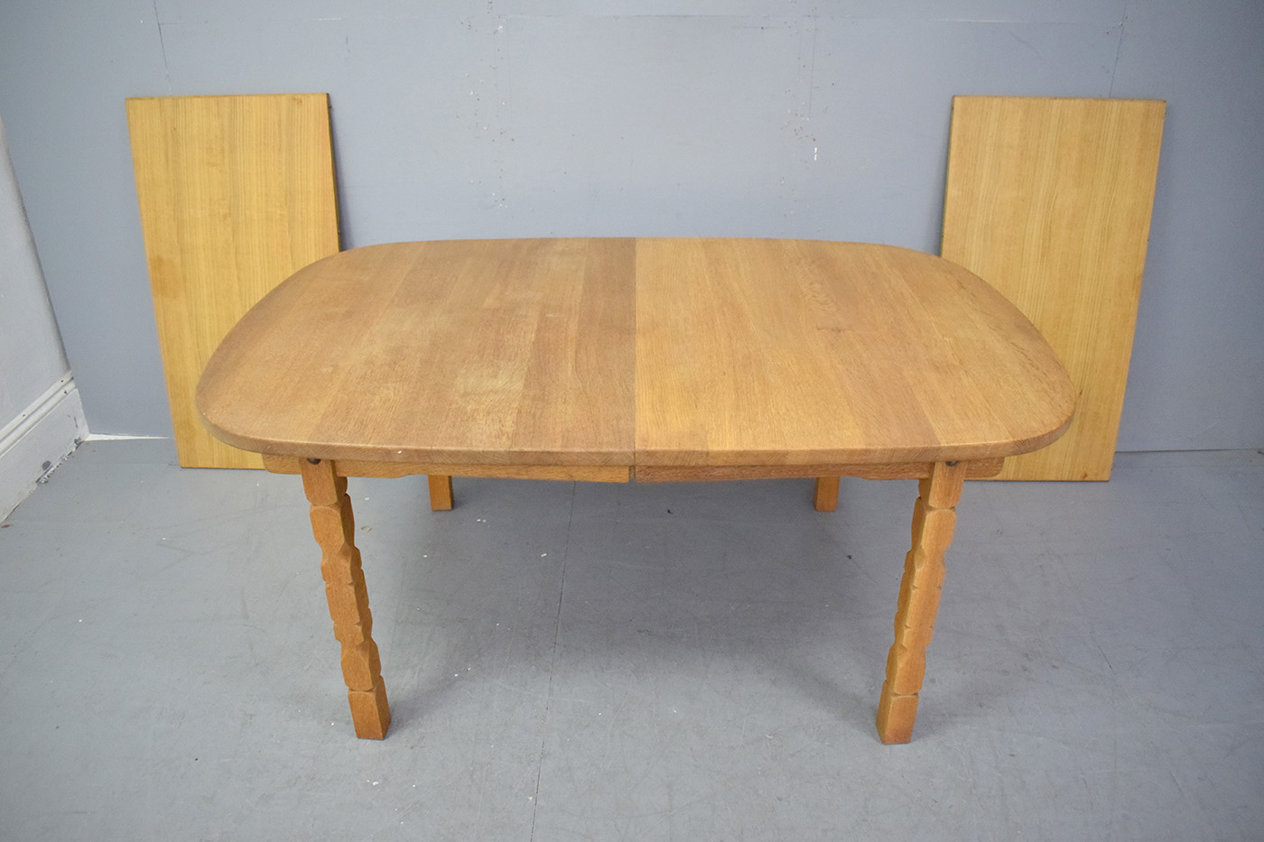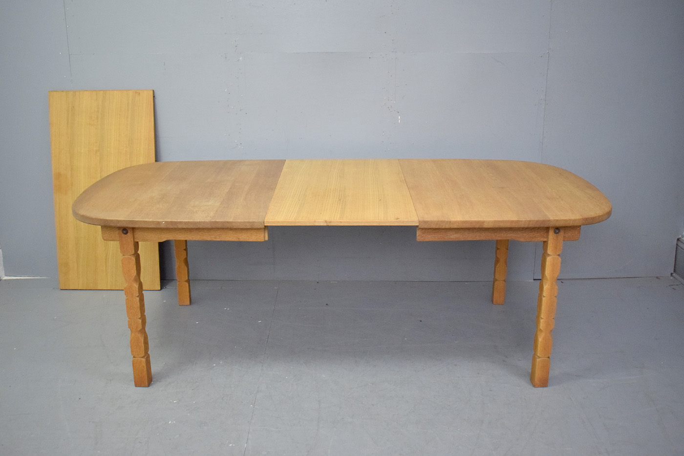 Extending solid oak dining table with turned legs, produced 1970s by Nyrup Mobelfabrik.