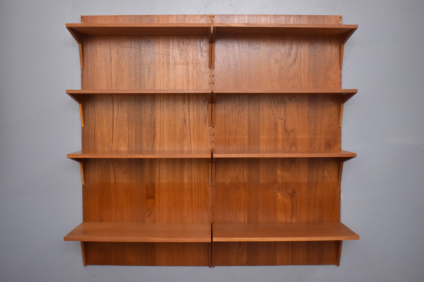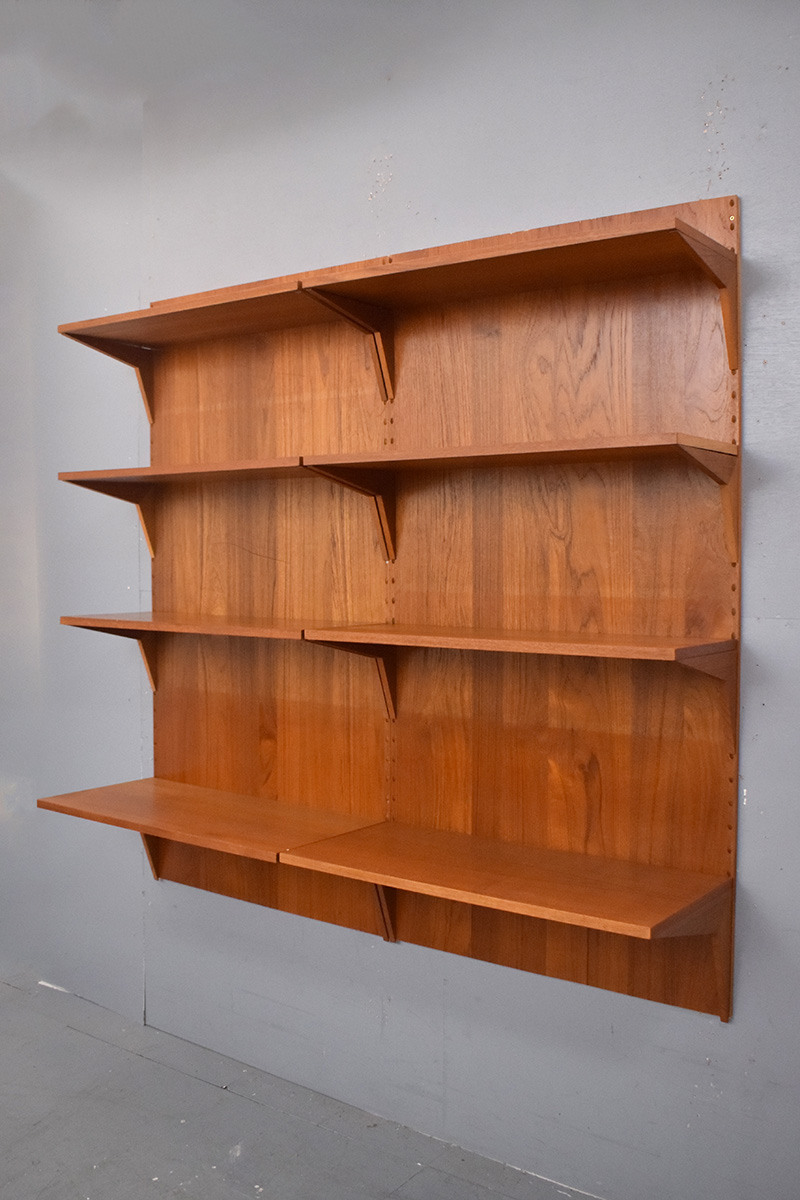 The system features 4 shelves in total (3x 30cm deep & 1 x 38cm deep) and has been gently cleaned and refurbished, treated with teak oil which helps to nourish and protect the wood.