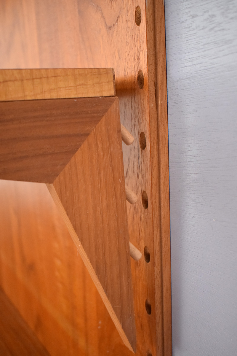 This compact bookcase features 4 shelves, each adjustable in height, fitting onto a wall mounted backboard in vintage teak. The shelves slot into the pre drilled holes and can be placed in any orientation you desire to suit your storage/display needs.