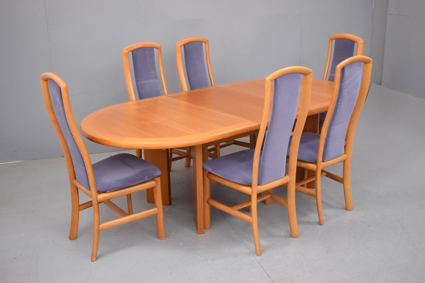 We have a matching set of cherry dining chairs produced by Skovby, available to view