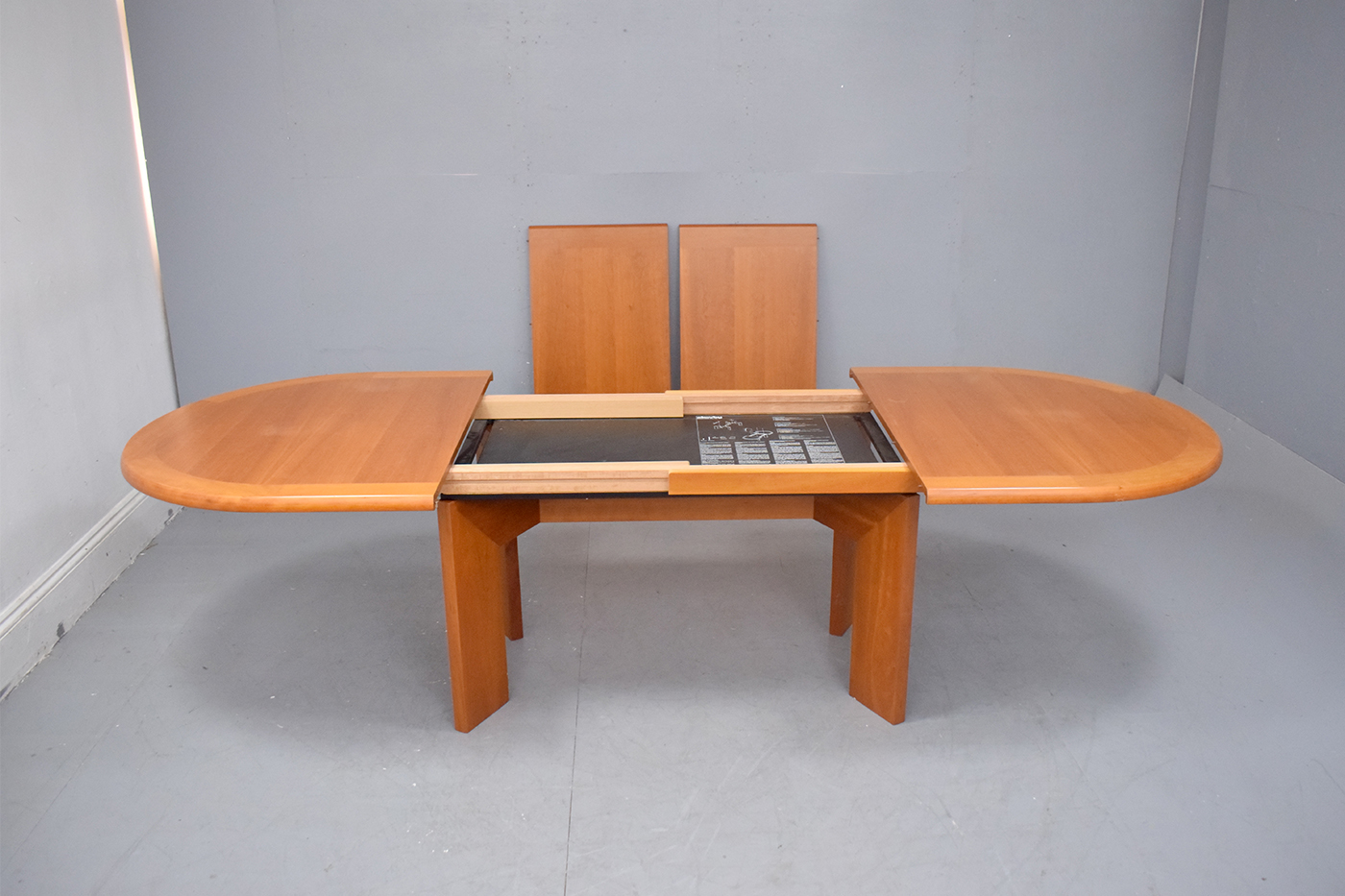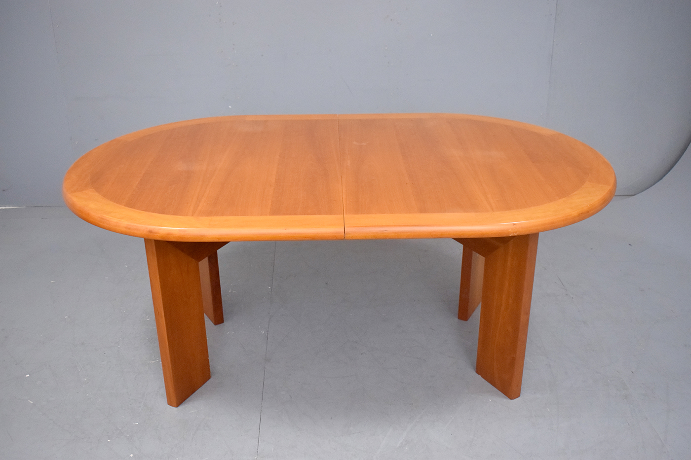 The table features an oval table-top with angled X style legs providing the table with excellent stability both pefore and after extention.
