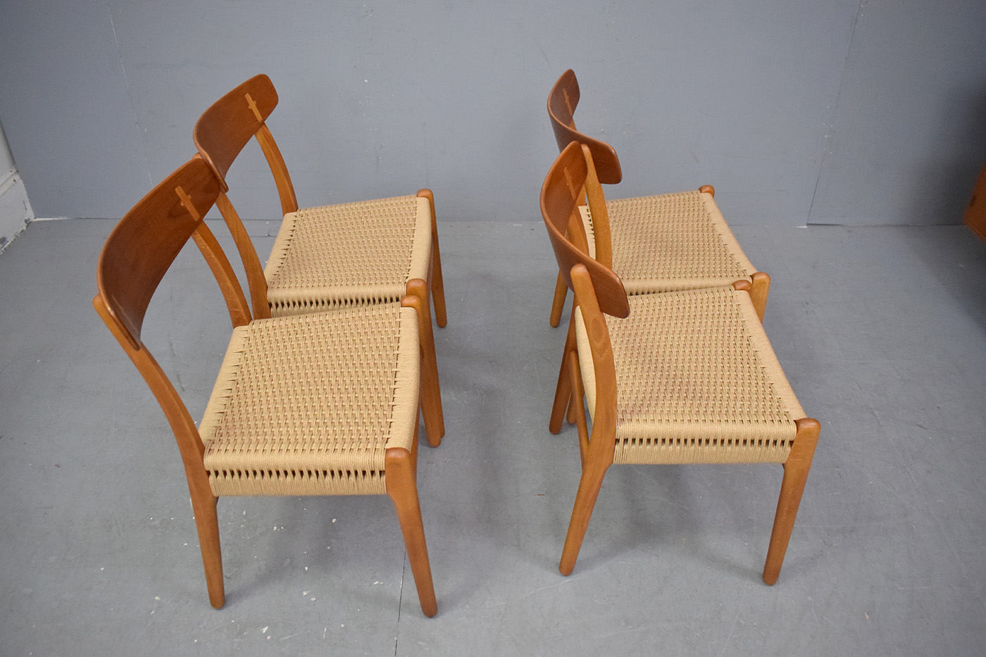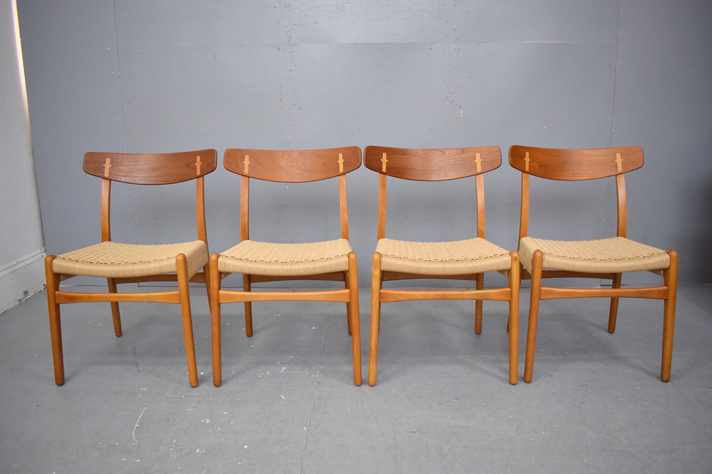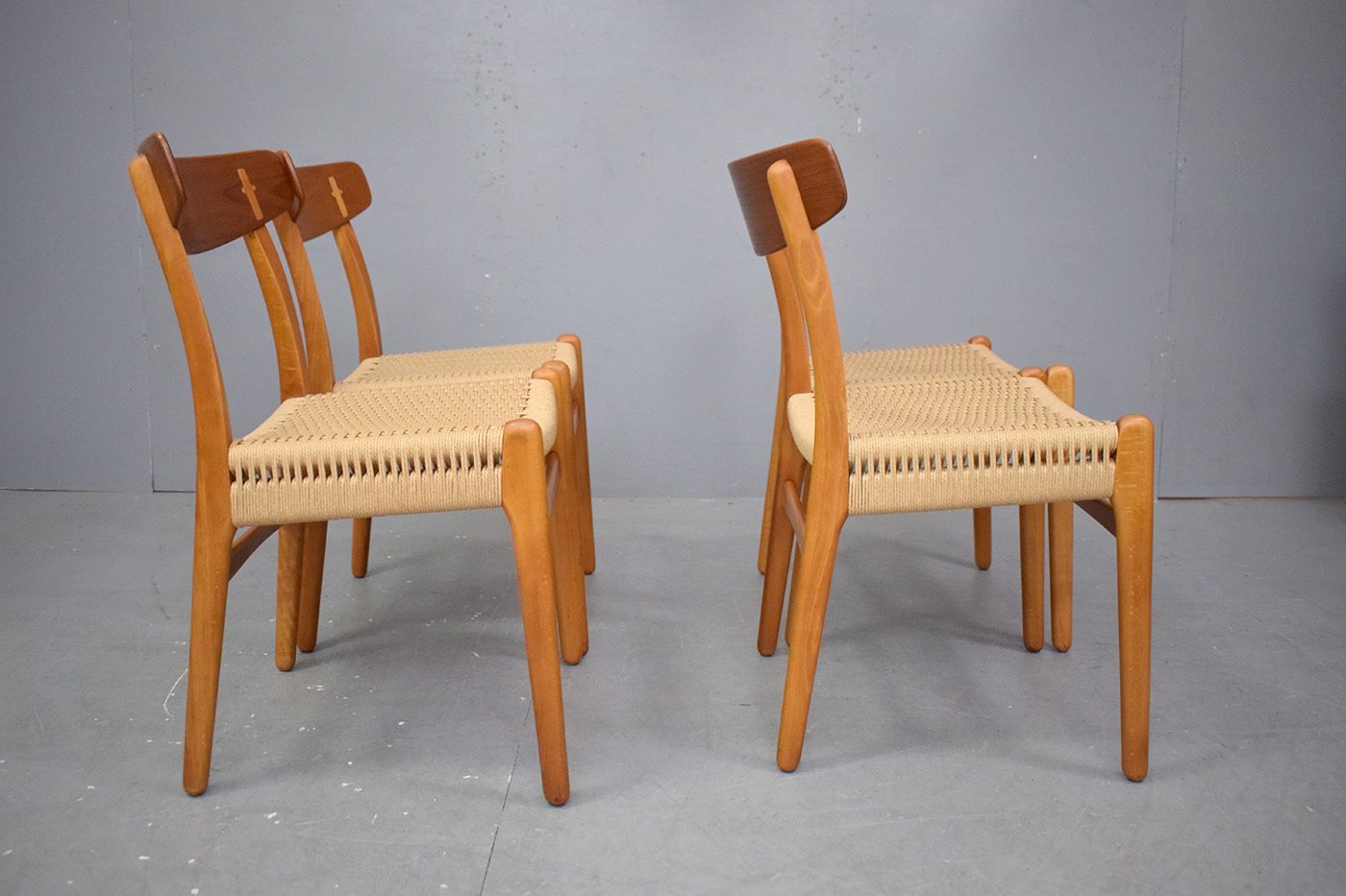 Set of 4 vintage beech frame dining chairs with teak backrest and NEW woven papercord seats. Model CH23 designed 1950 by Hans Wegner for Carl Hansen.