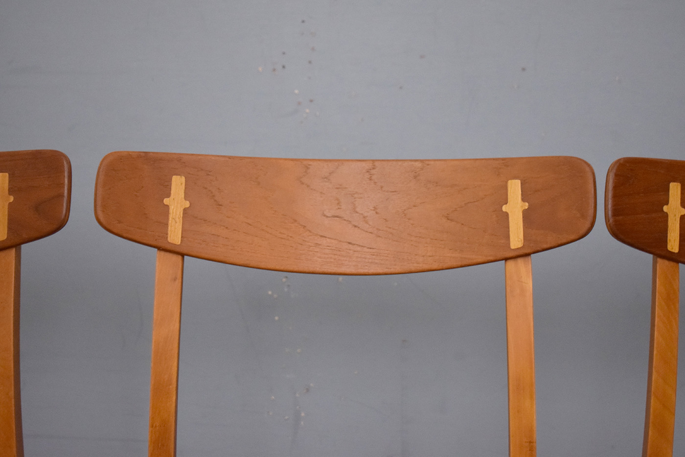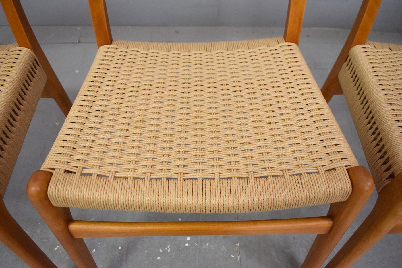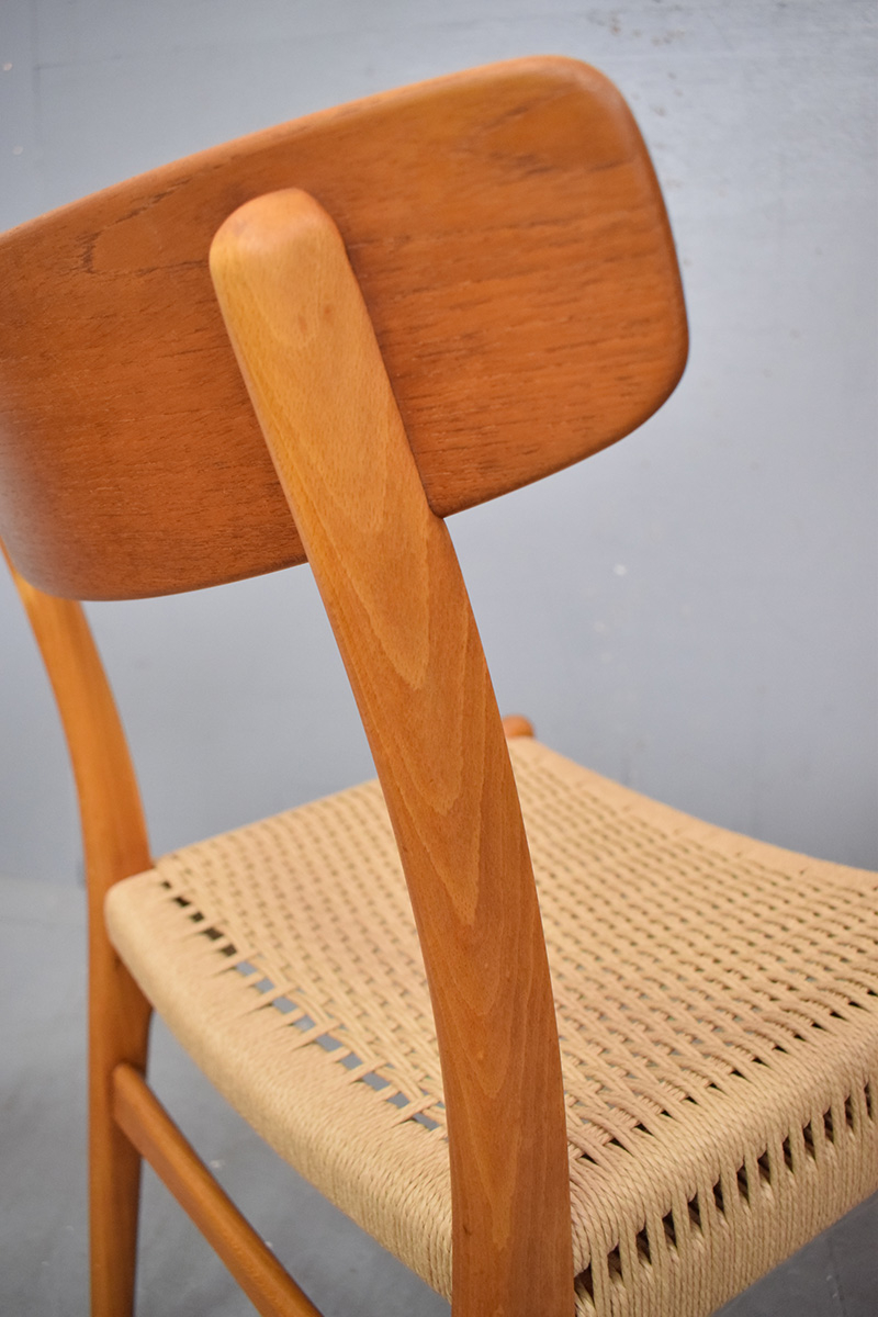 Set of 4 vintage beech frame dining chairs with teak backrest and NEW woven papercord seats. Model CH23 designed 1950 by Hans Wegner for Carl Hansen.
