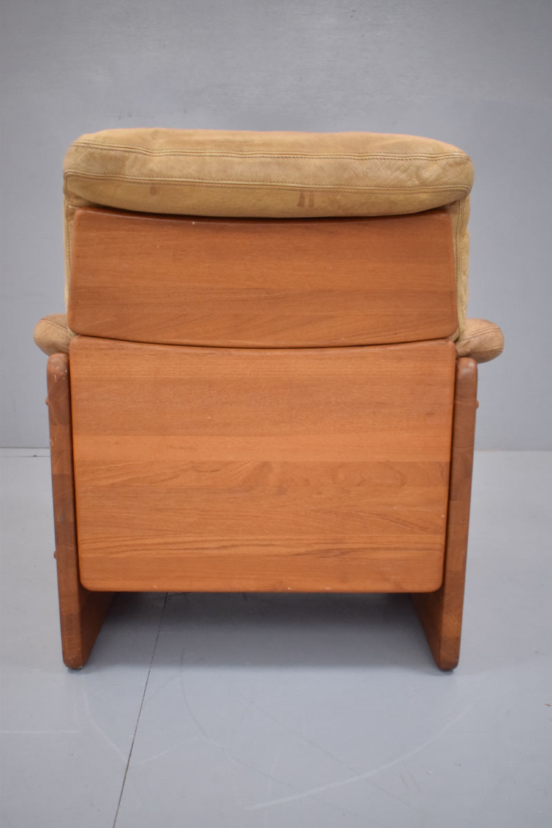 The chair has a sturdy solid teak frame with original buffalo leather upholstery showing patina and signs of use.