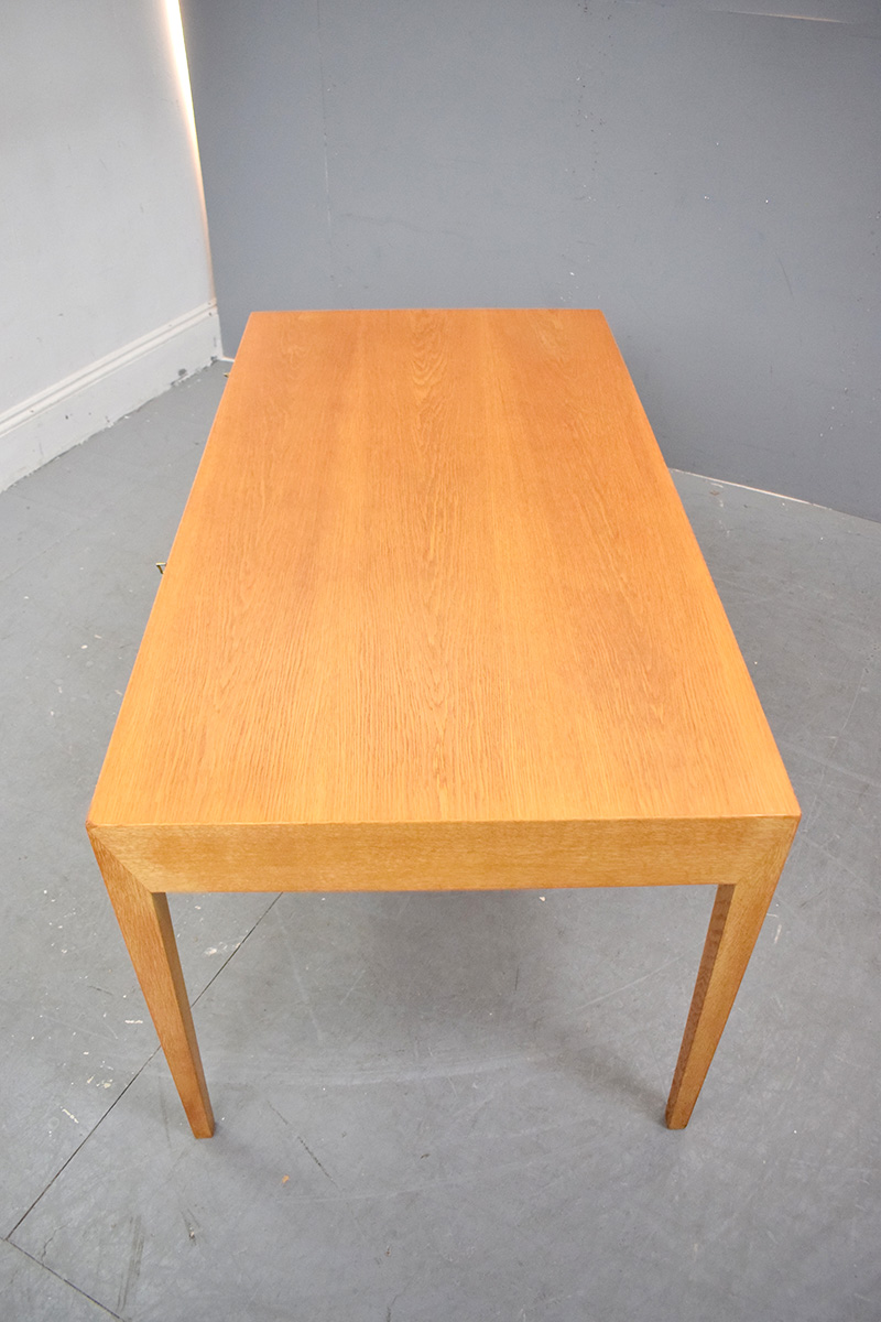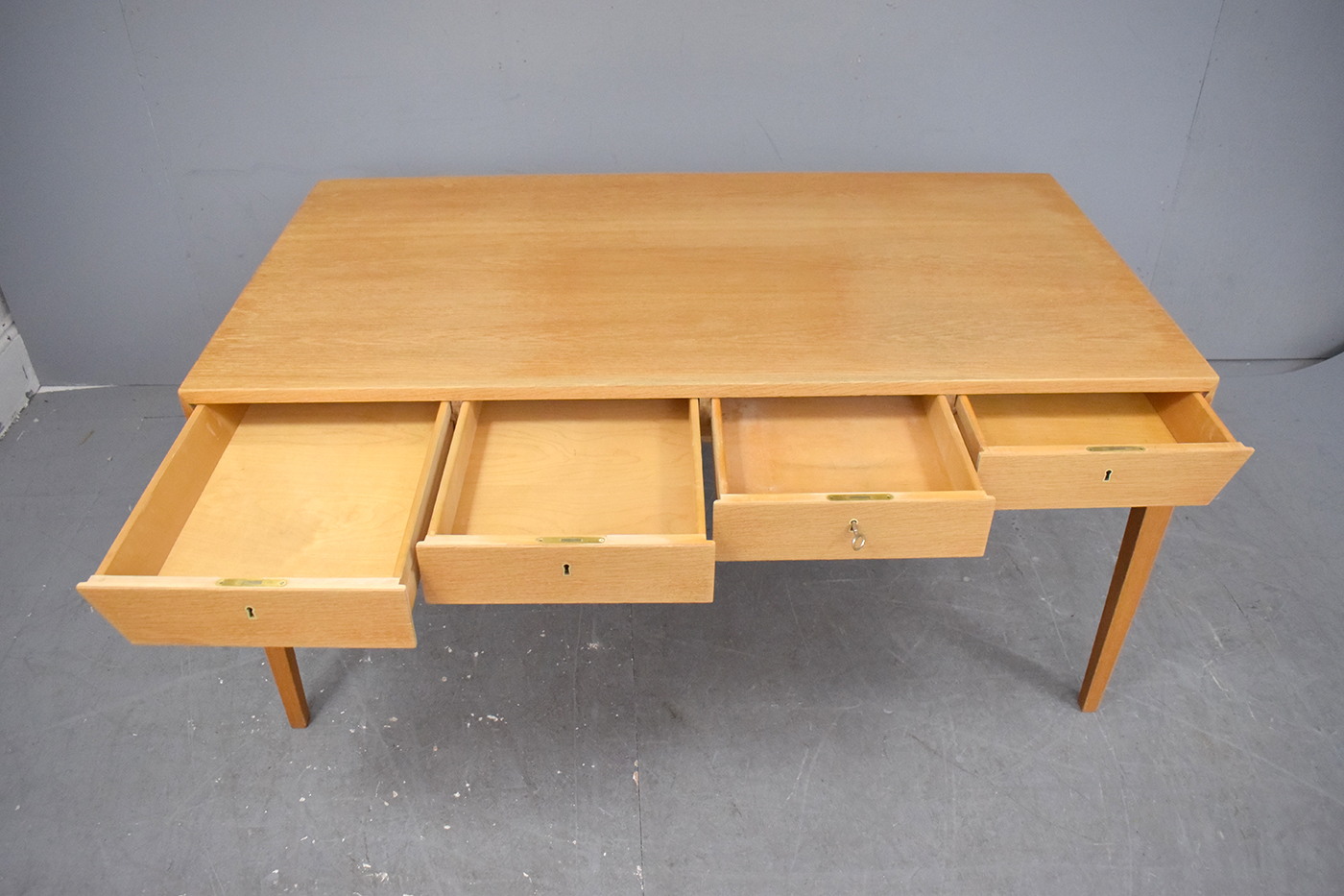 This elegant and slender desk with 4 drawers stands to make a statement in any room. A true midcentury collectors item. Superbly rare, especially in this light oak construction.
