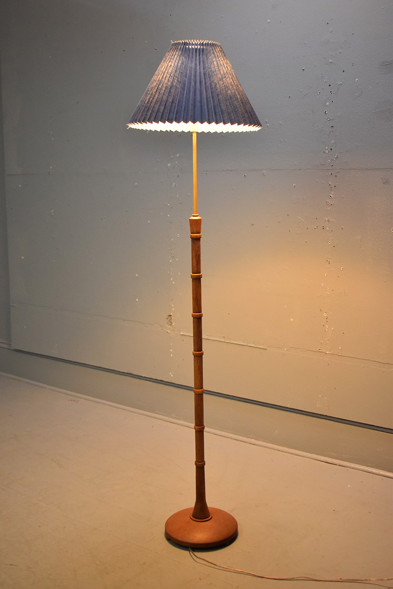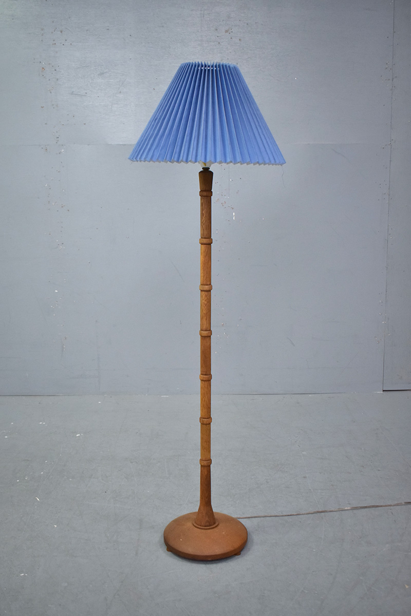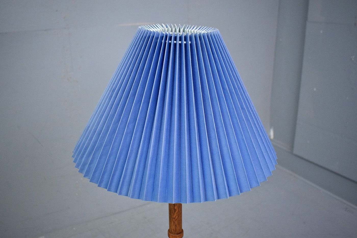 Beautiful vintage floor lamp in oak and brass with height adjustable column and pleated blue shade made by Danish Mobelfabrik.