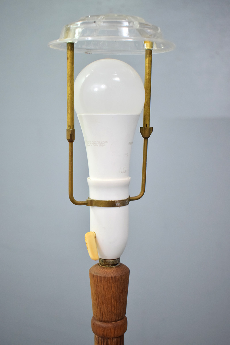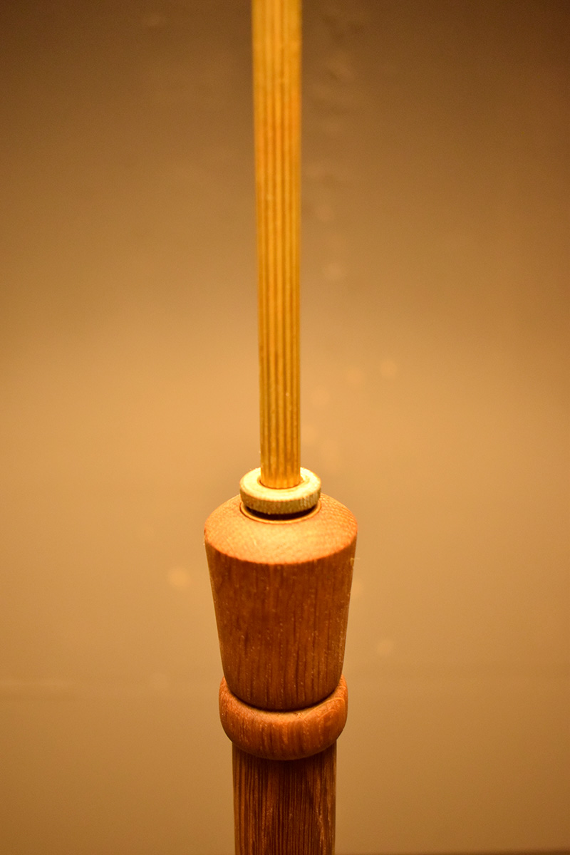 The lamp is produced with a tall turned teak column and extending hardware in brass.