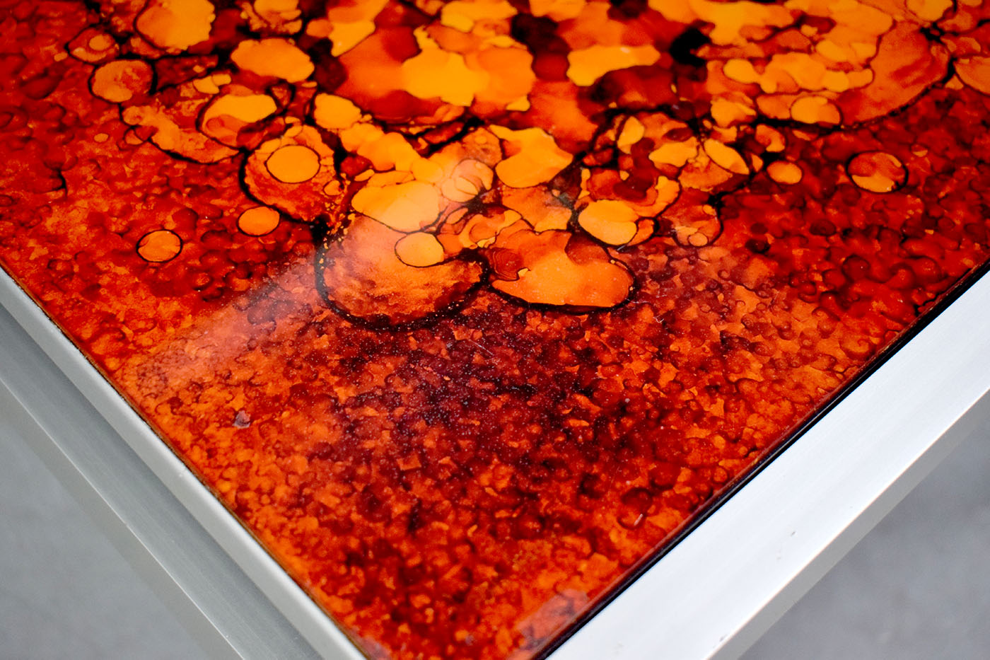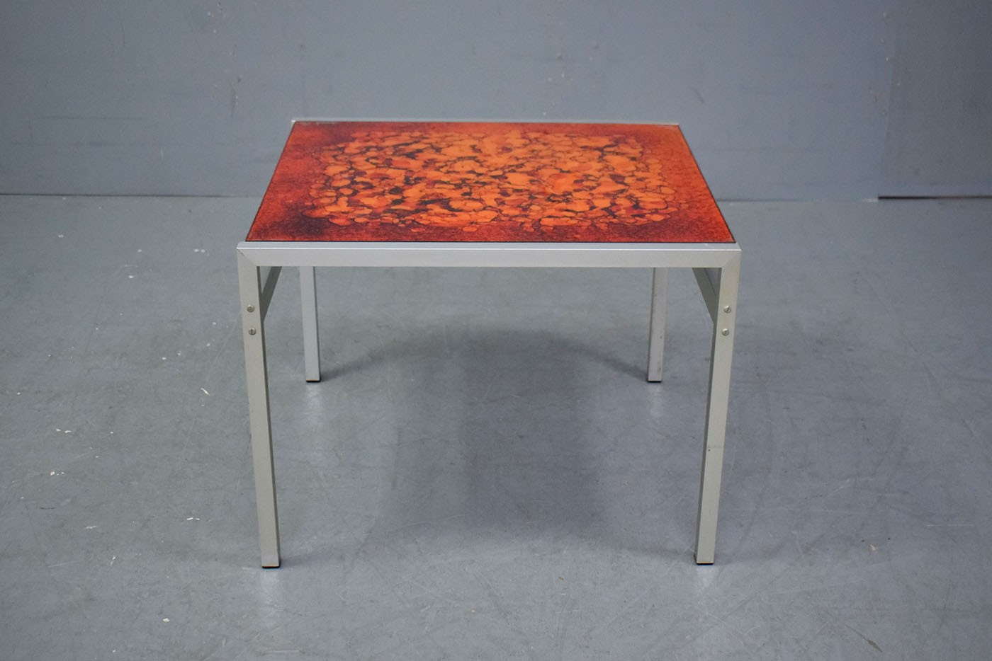 These gorgeous vintage tables feature unique eye catching orange and red marbled glass tops, perfectly complimented by the aluminium frames.