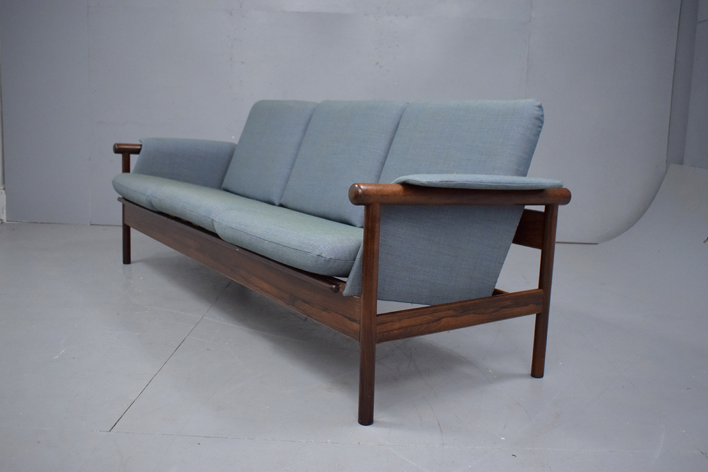 Very rare vintage rosewood frame 3 seater sofa designed by Illum Wikkelso and produced 1966 by Koefoeds Mobelfabrik model WIKI.A stunning design fully refurbished with new cushions and upholstery.