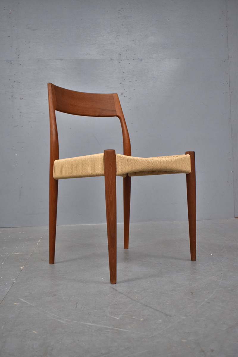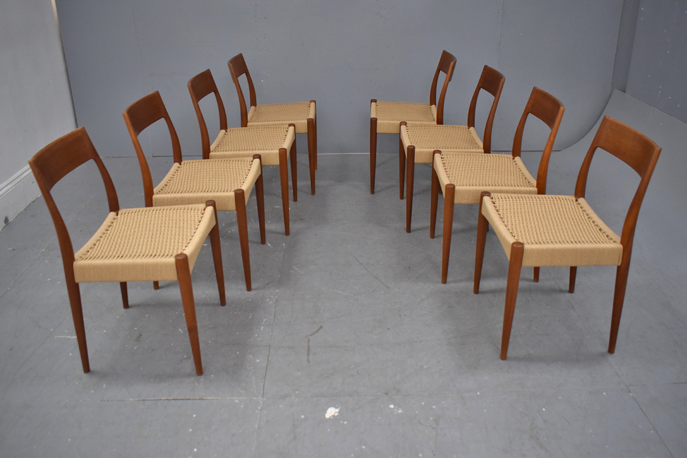 Set of 8 vintage teak dining chairs with new woven seats in papercord designed by Arne Hovmand Olsen and produced 1955 by Mogens Kold model Mk175.