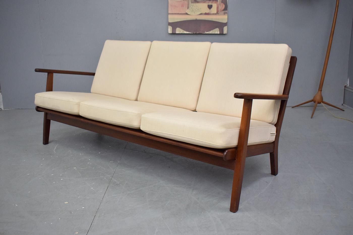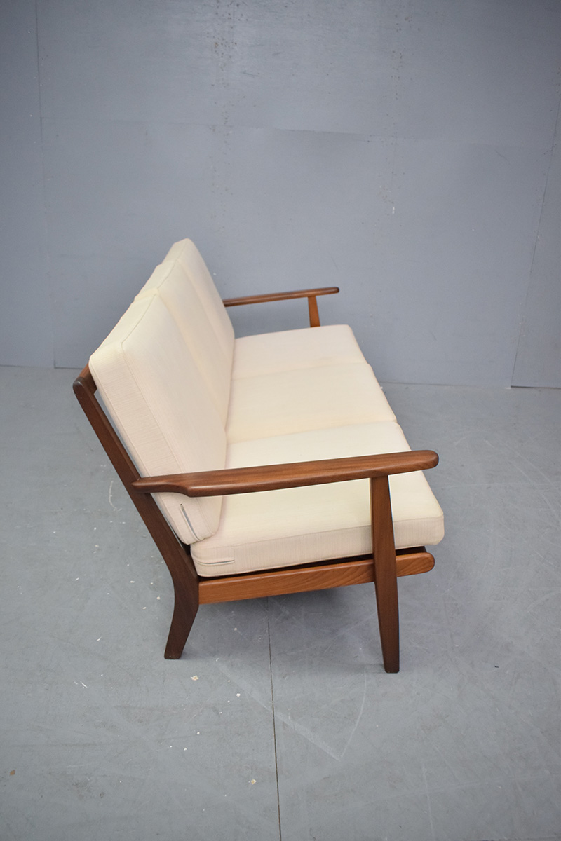 This classic midcentury sofa has all the signs of being a model that was designed by Hans Wegner, but it is not and the designer did land himself into trouble with Hans Wegner because of this.
