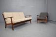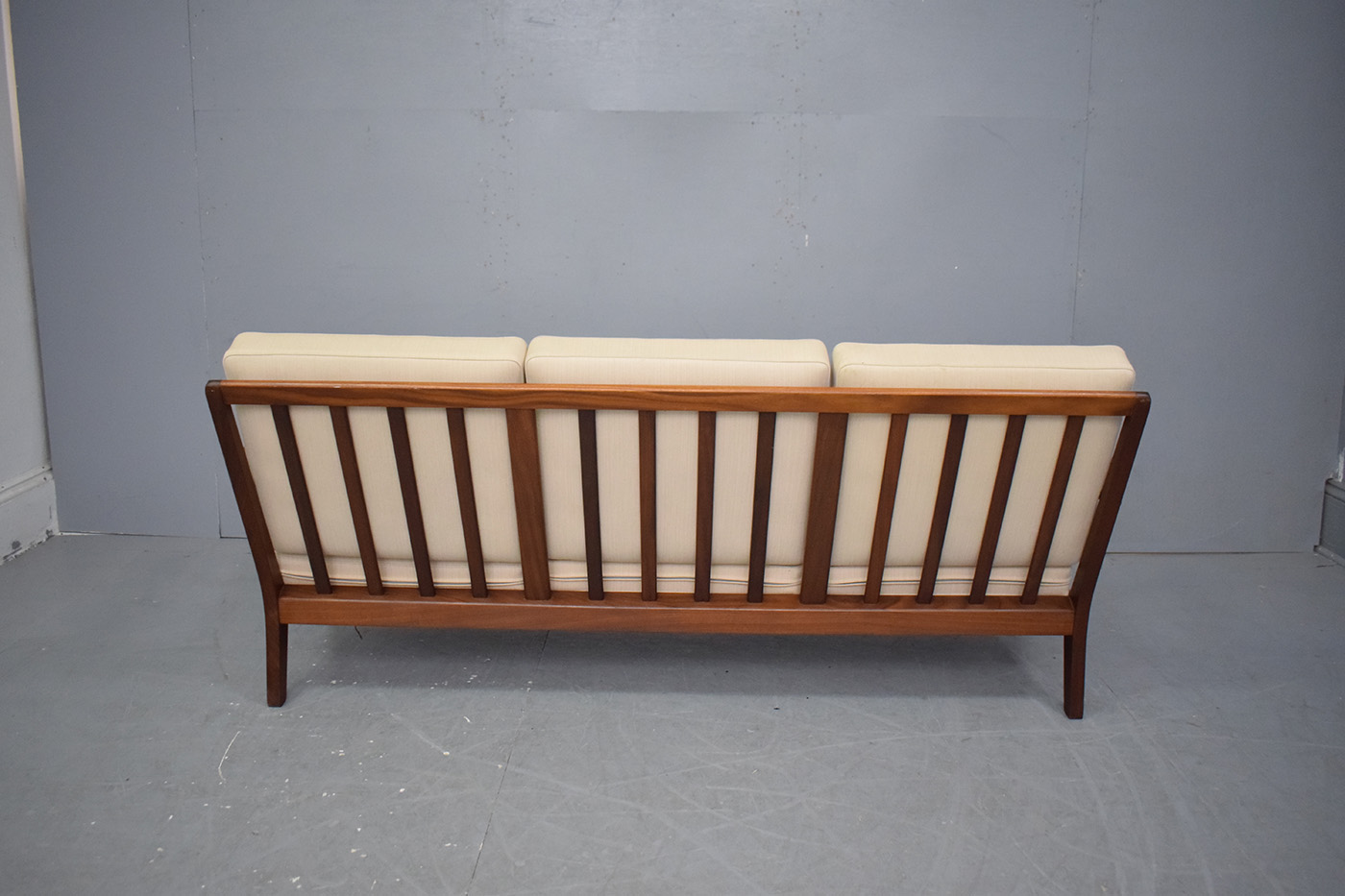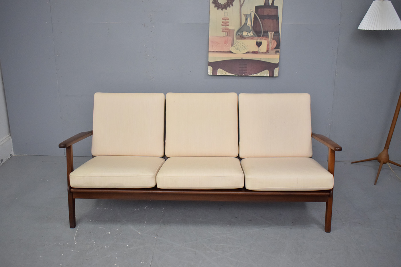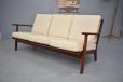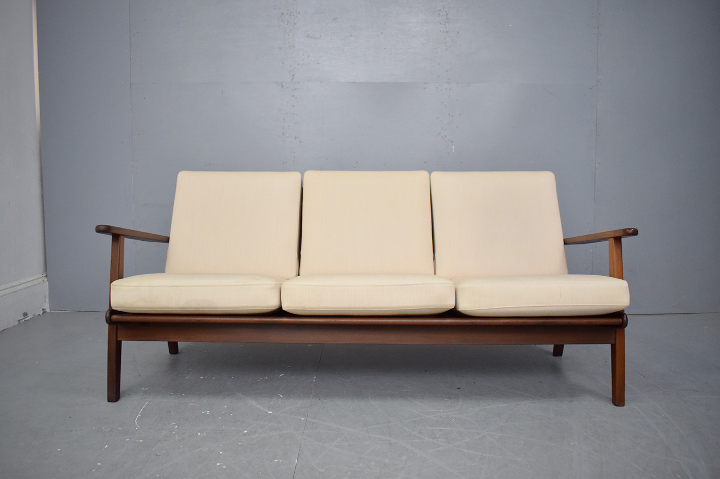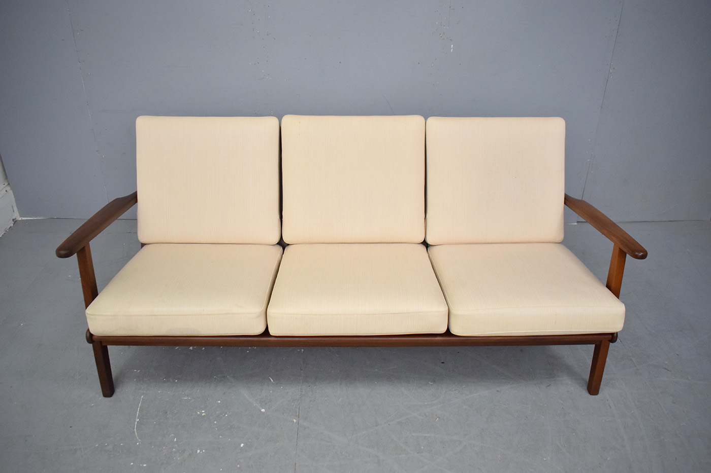 Stylish vintage 3 seat sofa with solid teak frame, sprung cushions which are original upholstered in off-white. Designed by Aage Petersen & Produced by GETAMA model GE88
