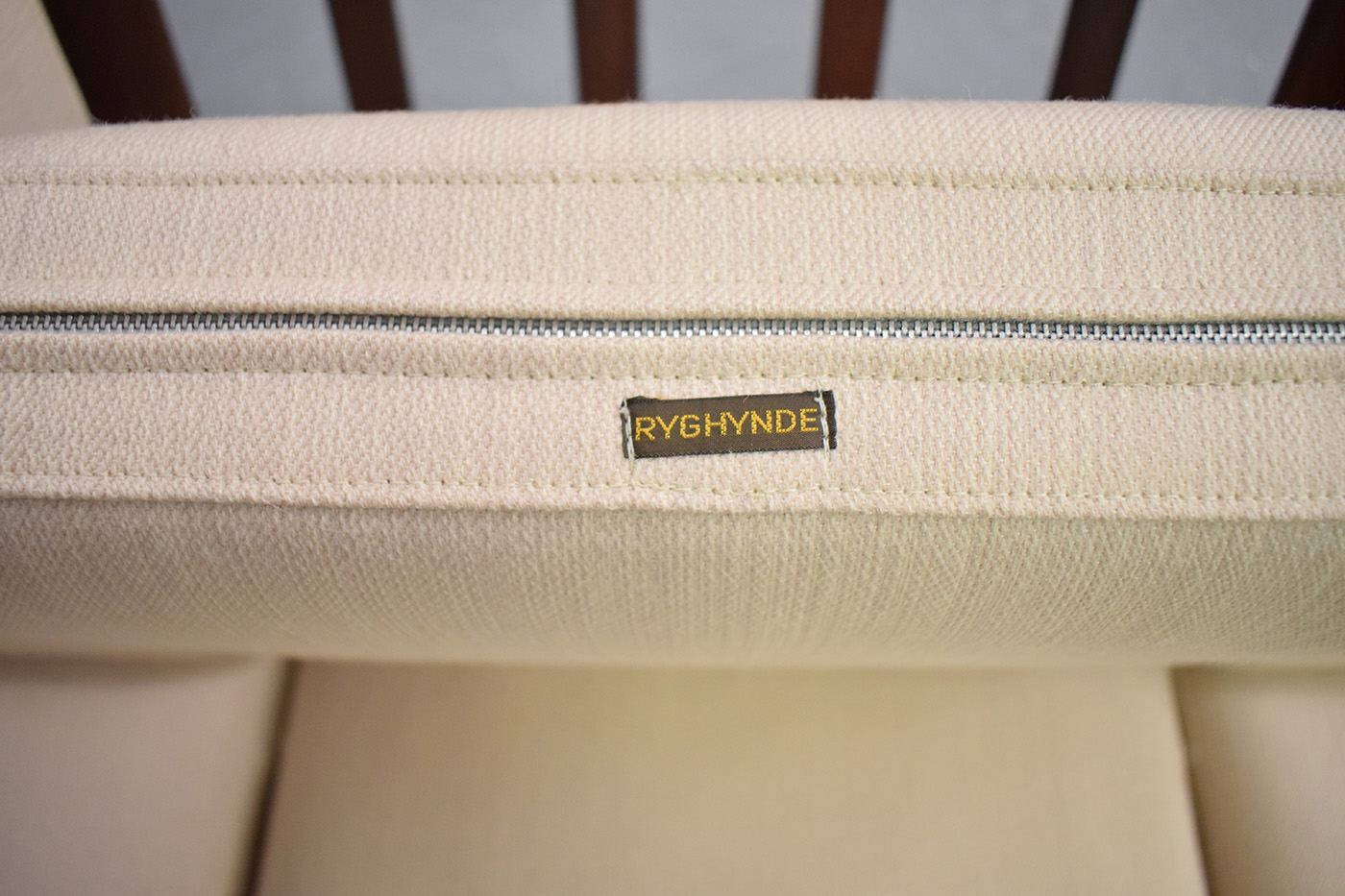 The original sprung cushions have original covers in off-white colour fabric made by Danish Art-weaving.