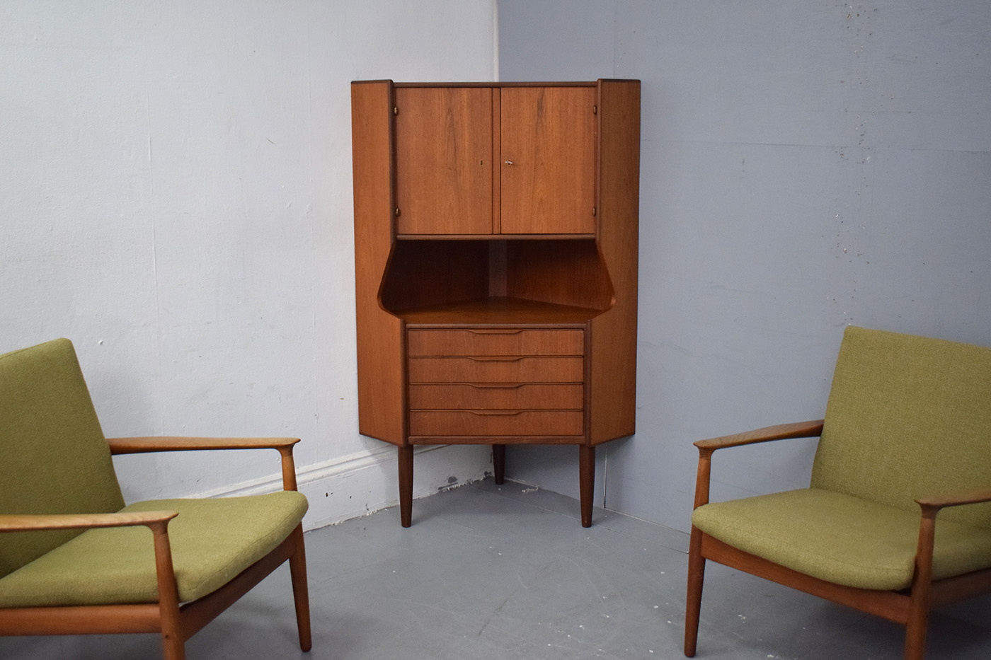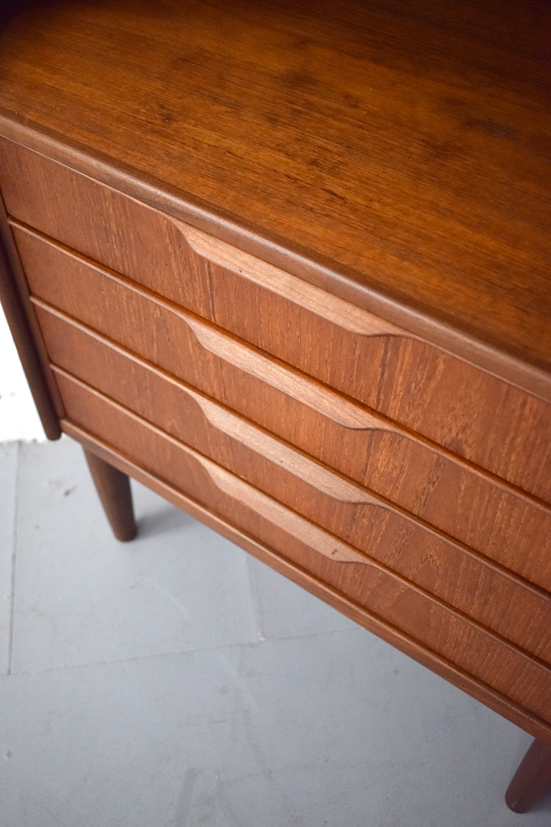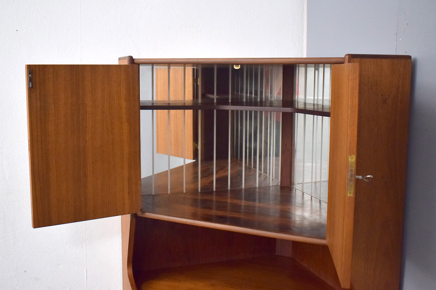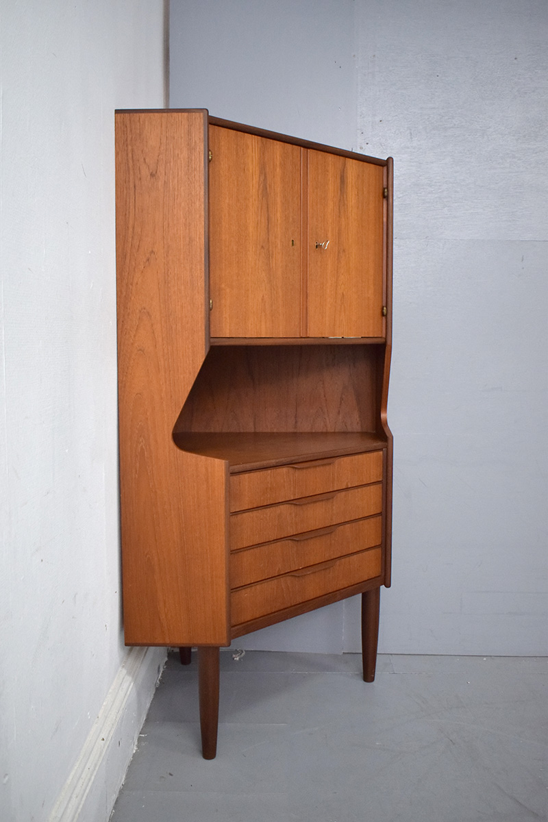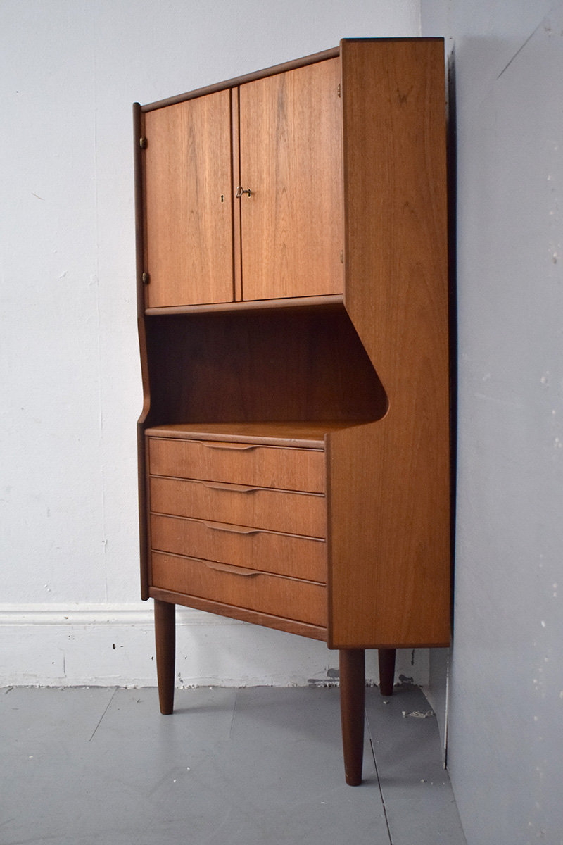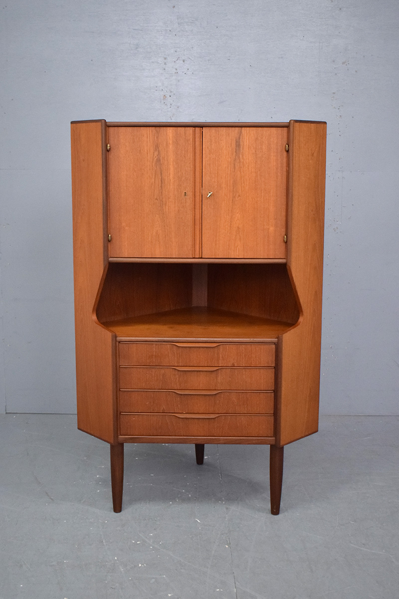 Midcentury vintage teak corner cabinet with mirrored inside and set of 4 drawers produced 1960s by Danish Mobelfabrik.