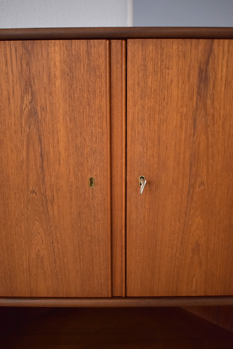 The inside of the bar cabiet is lined with rosewood, providing a luxurious feel when you open the doors, showing incredible grain structures throughout. This is a rare instance that teak and rosewood are used together, as they don't usually mix, aside from rosewood being used to highlight small sections or joins of a cabinet, such as this Bramin sideboard.