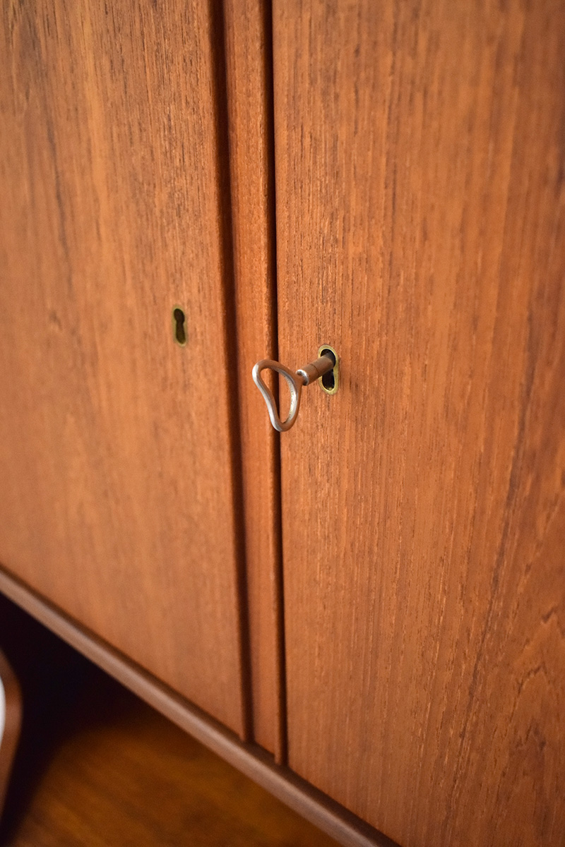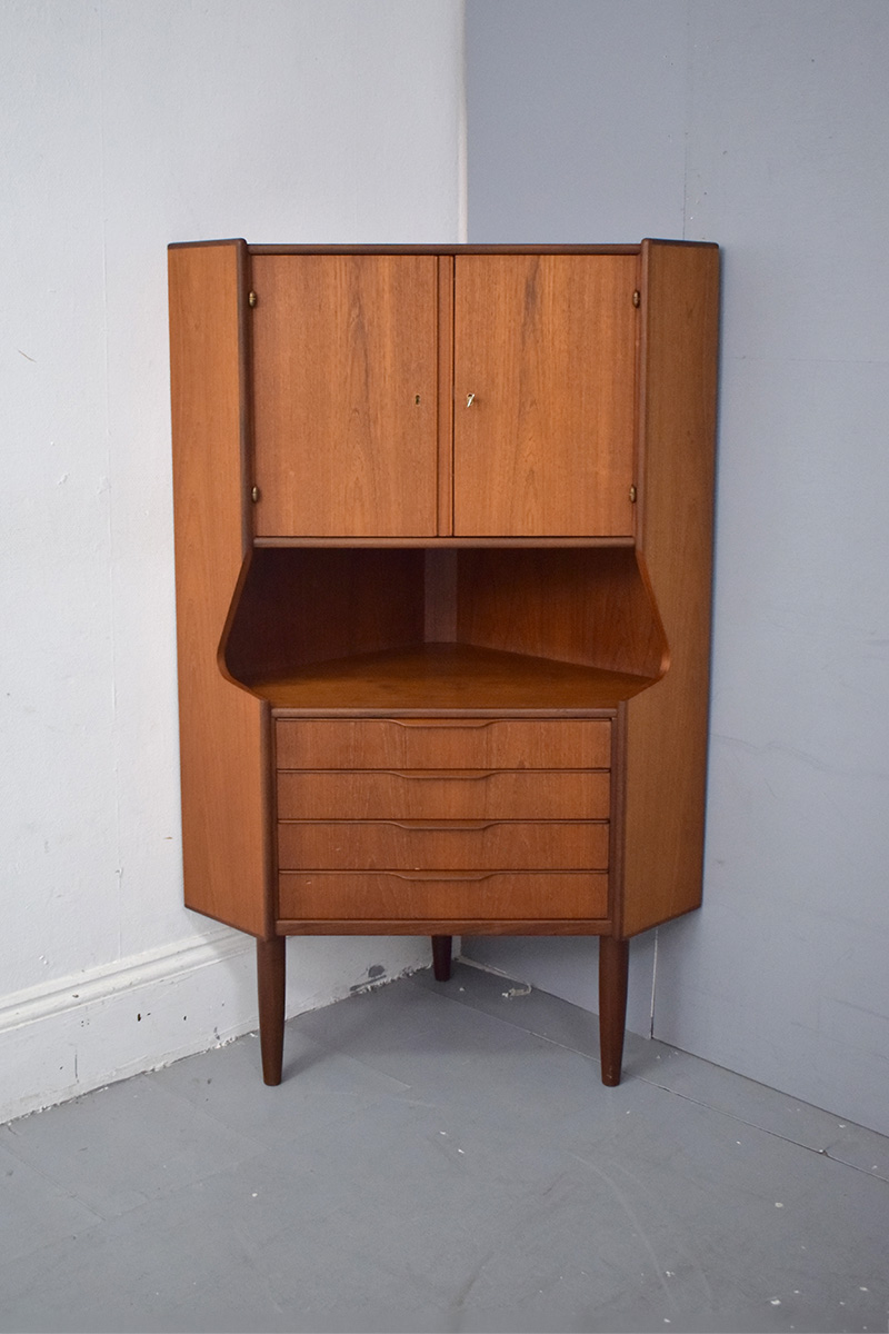 This lovely corner cabinet features a stunning vintage teak exterior, fully refurbished here at Danish Homestore. the wood has been treated with teak oil, helping to nourish and protect the wood and maintain the warm, vintage patina.