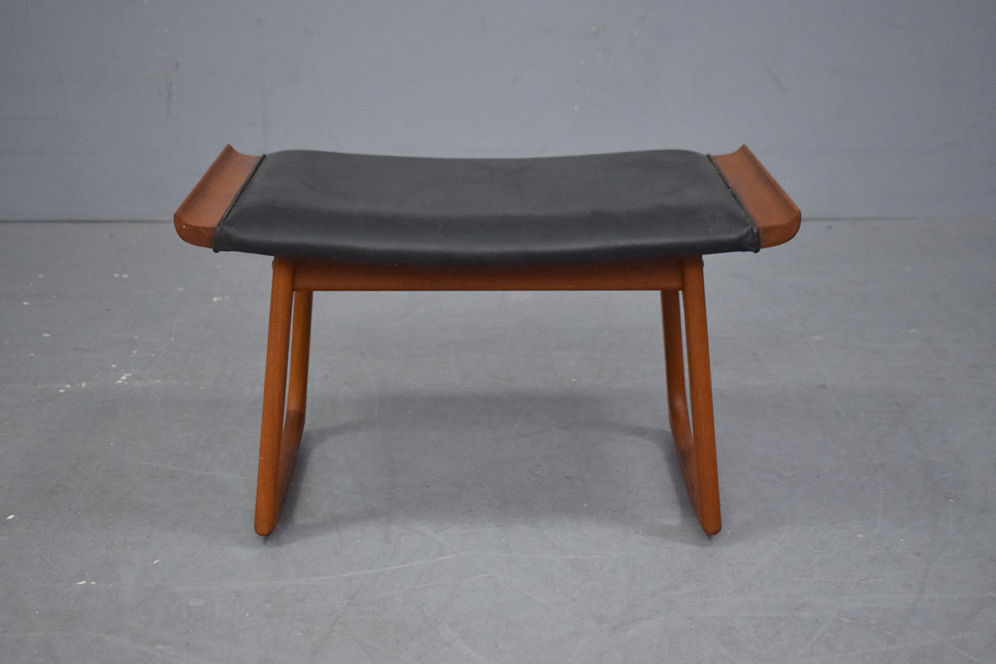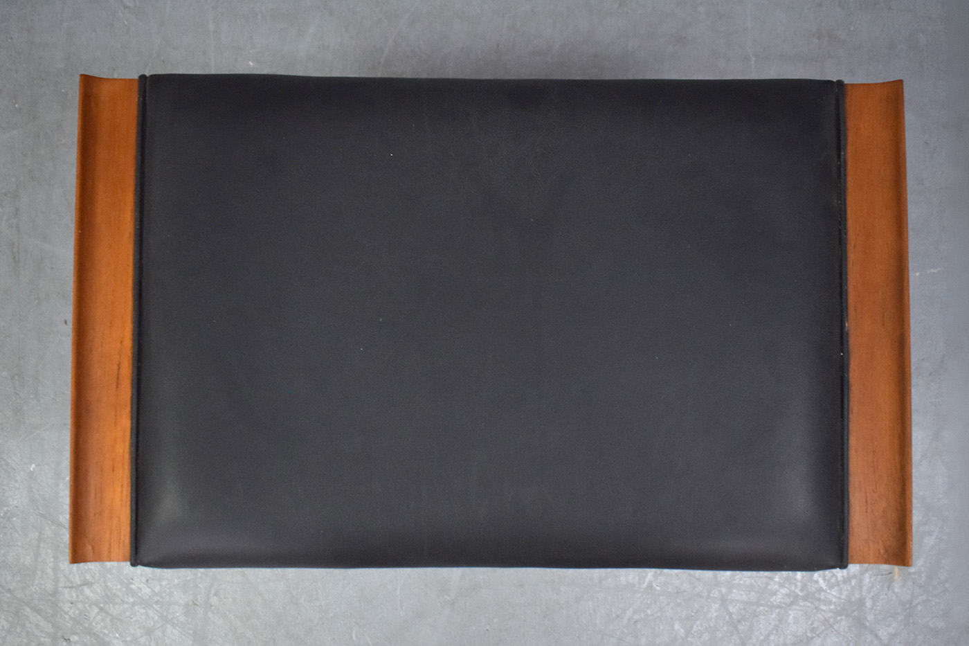 This elegant footstool features minimalist design, with lovely solid vintage teak construction and original black leather upholstery showing stunning patina.