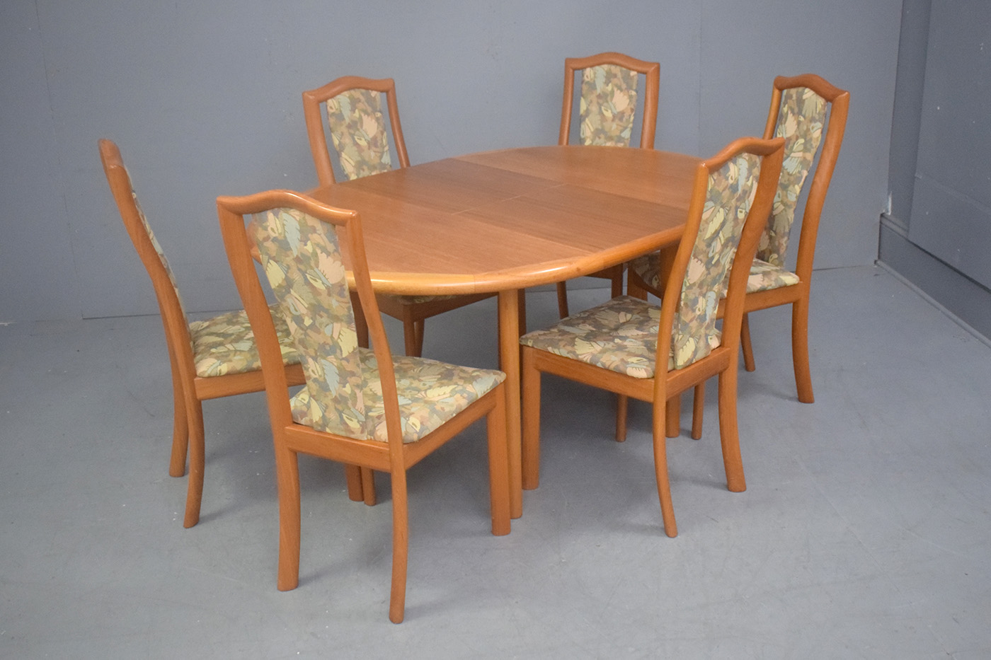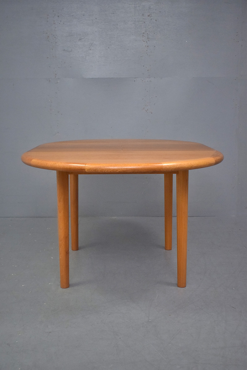 The table sits neatly on solid teak oval legs, providing a sturdy base for the dining table.