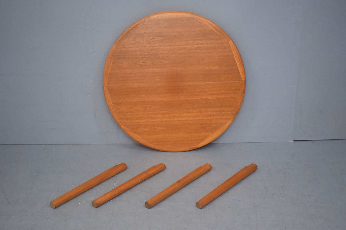 Compact vintage teak round top dining table, extending with a fold out leaf, produced by Danish Mobelfabrik, 1970s.