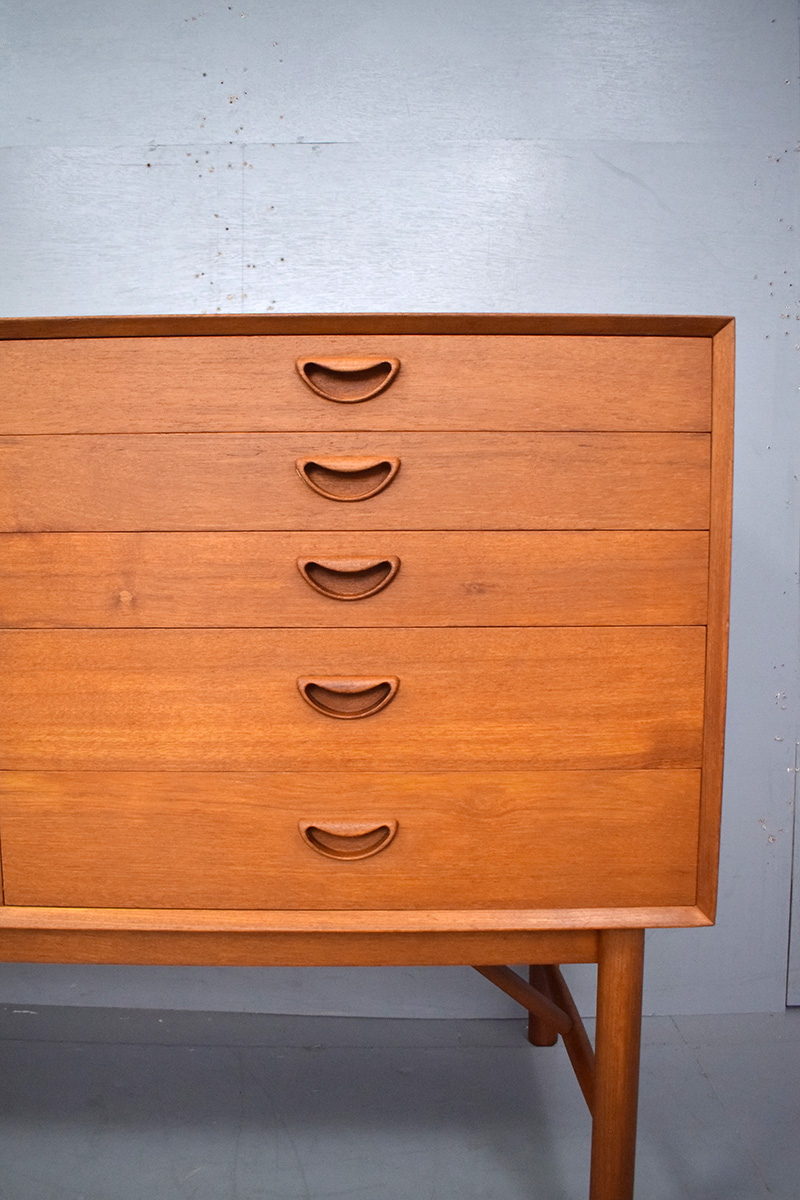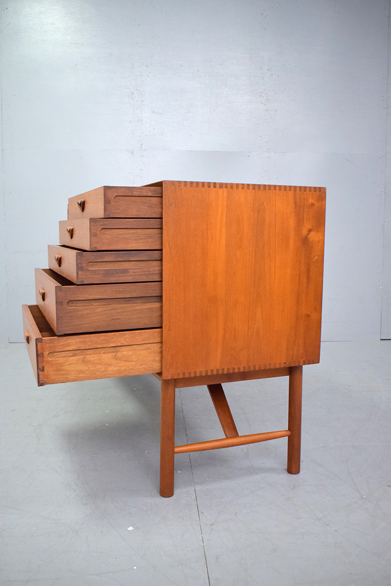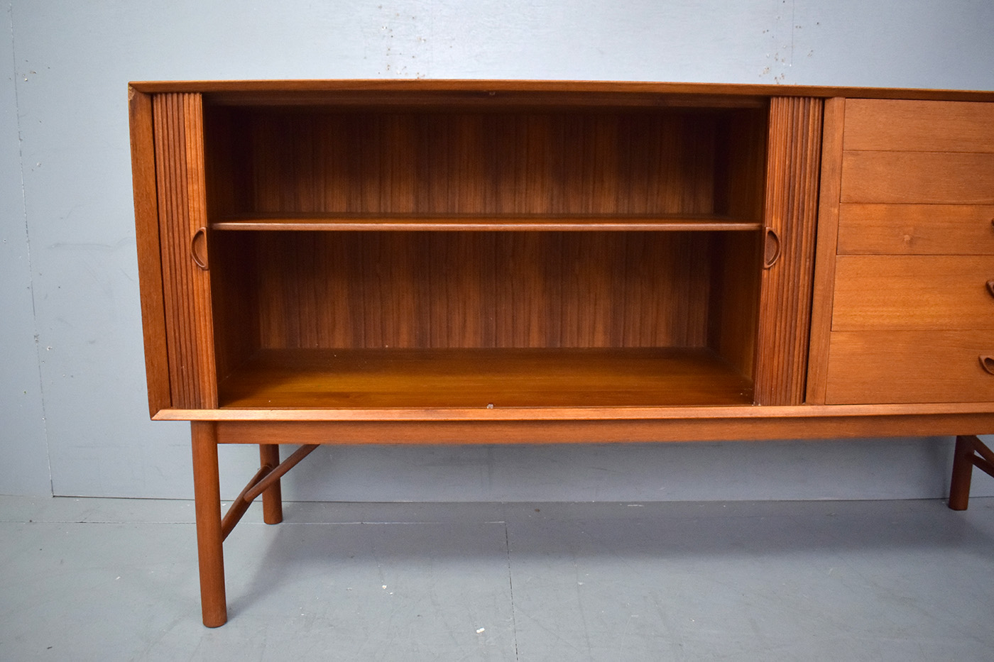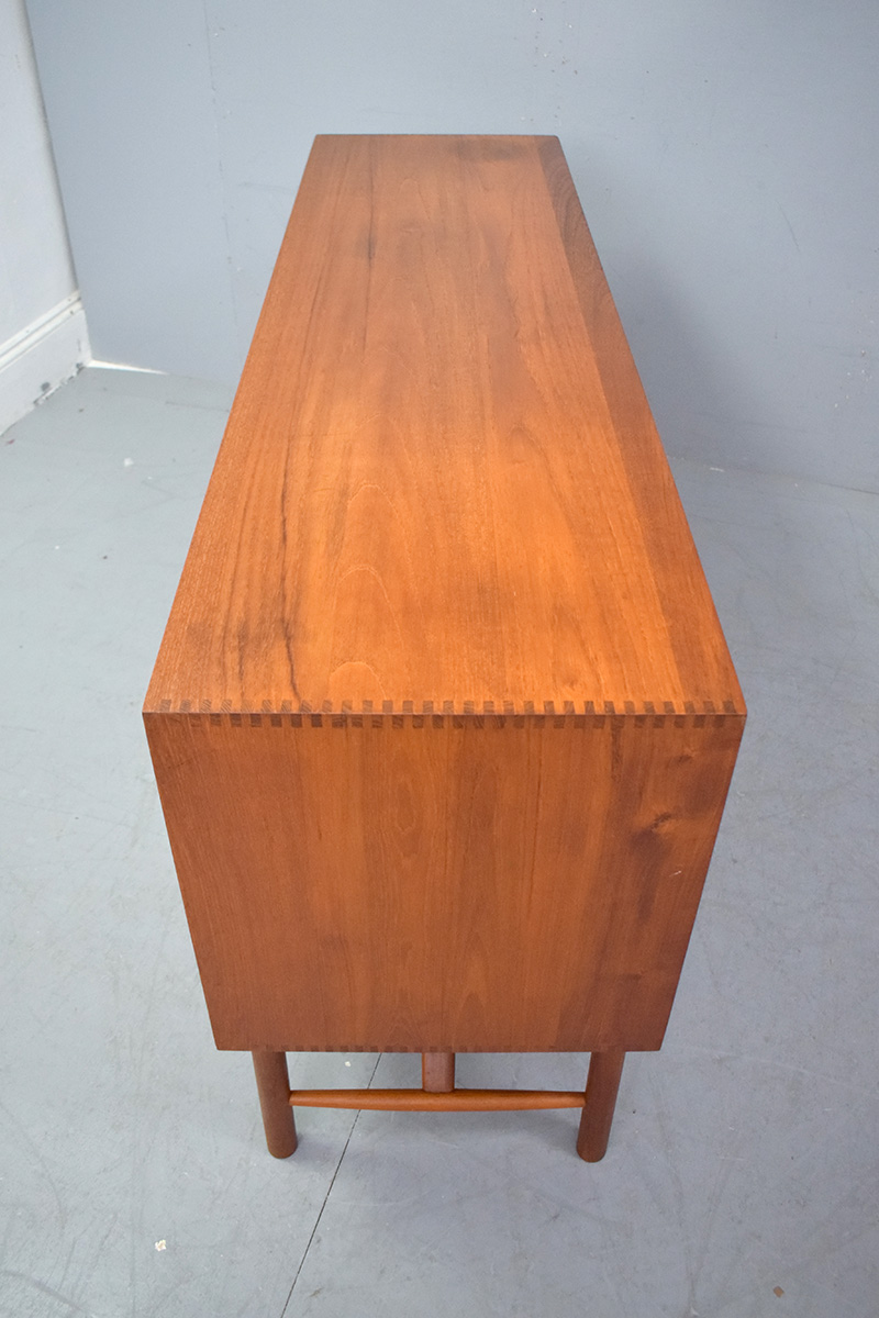 The sideboard is supported by solid teak braces and legs, ensuring durability and structural integrity whilst giving the cabinet a lighter appearance.