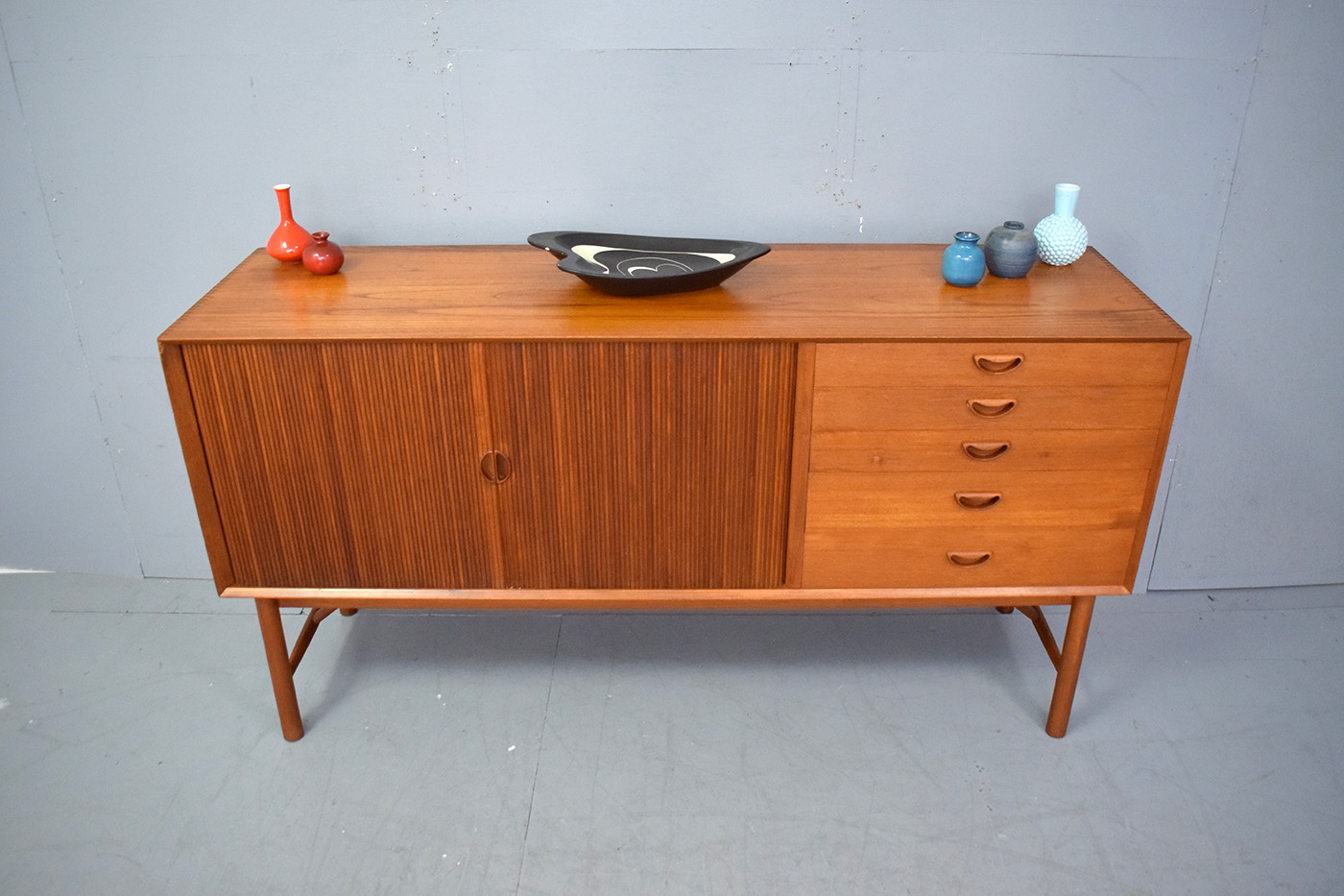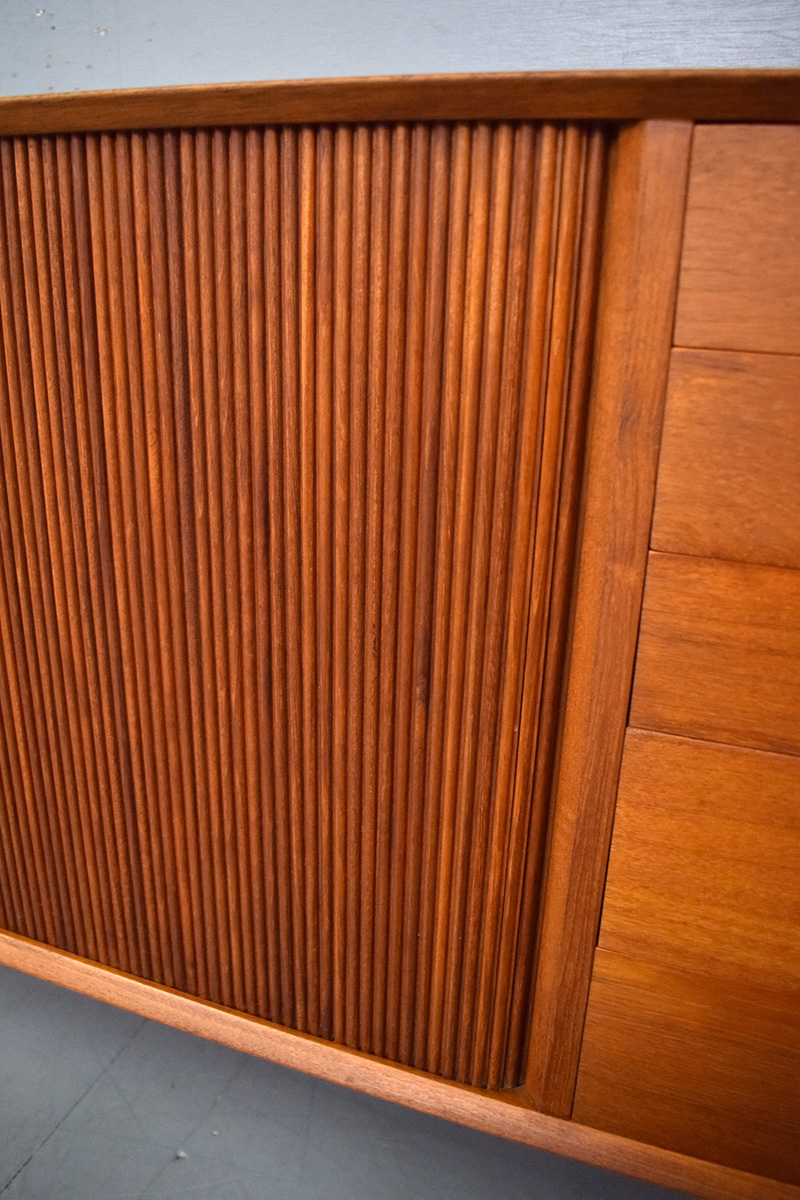 Rare vintage teak sideboard with tambour doors and drawers designed in 1954 by Peter Hvidt and Orla Molgaard, Produced by Soborg Mobelfabrik.