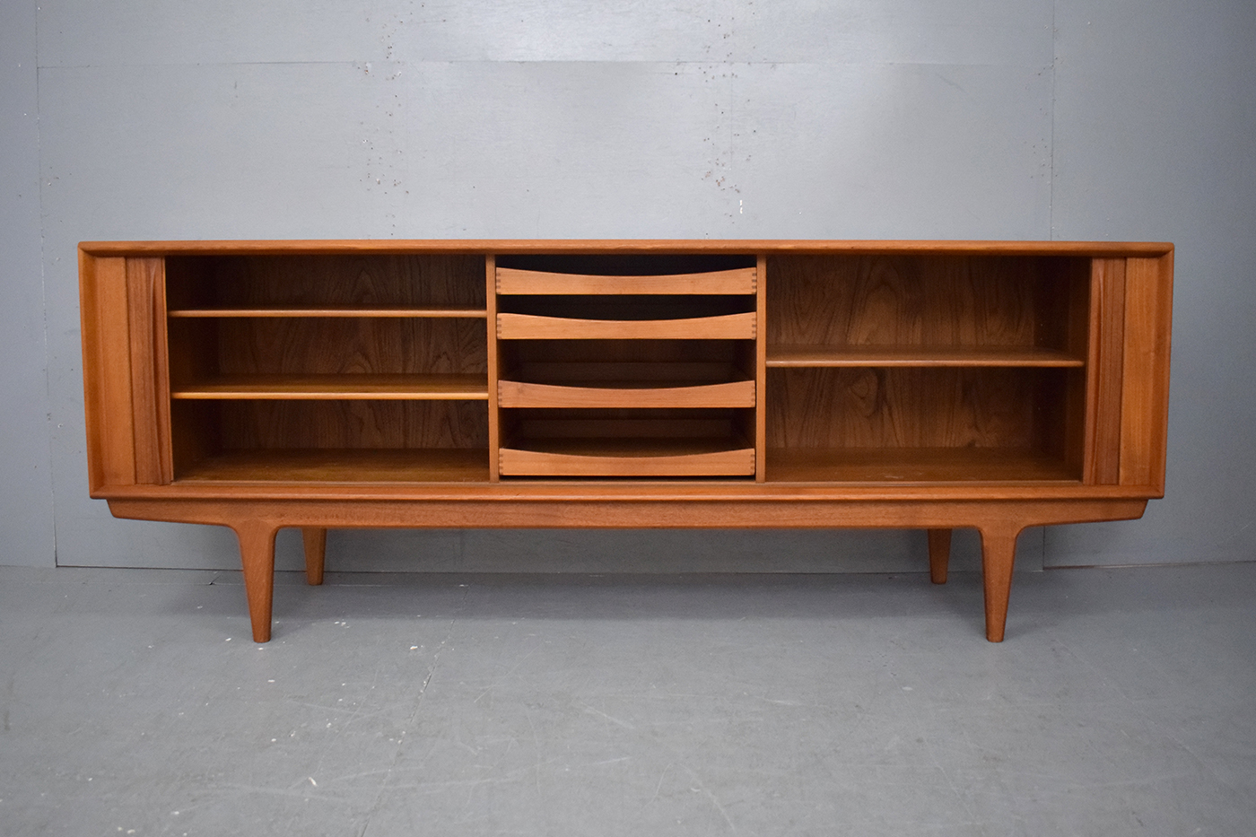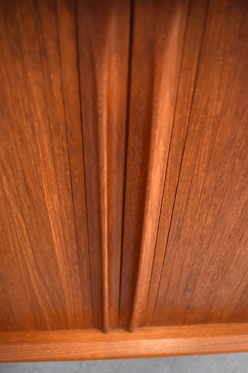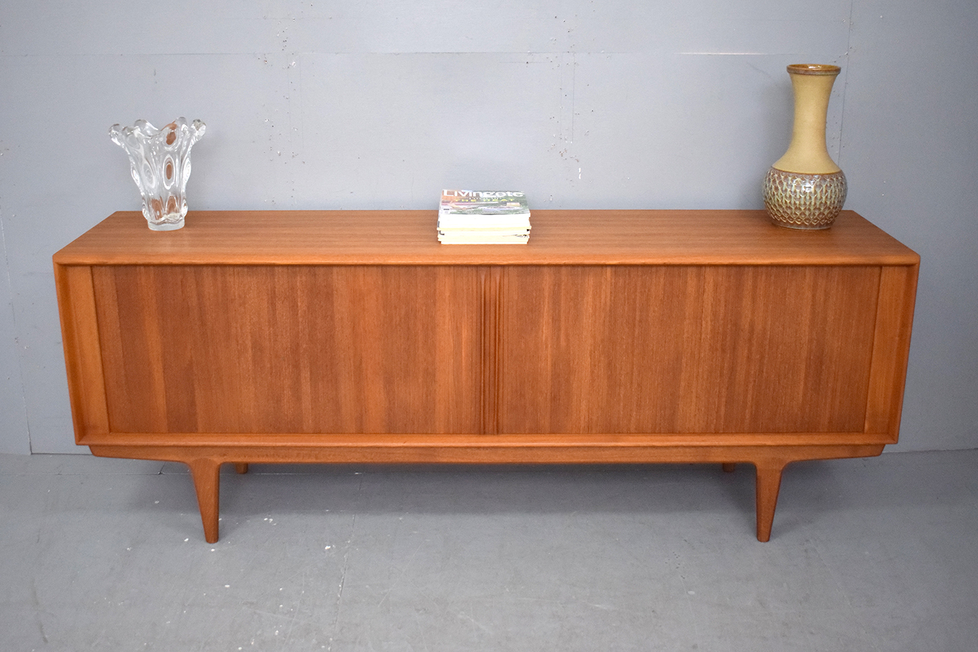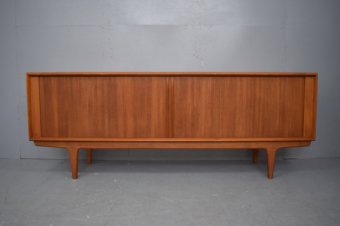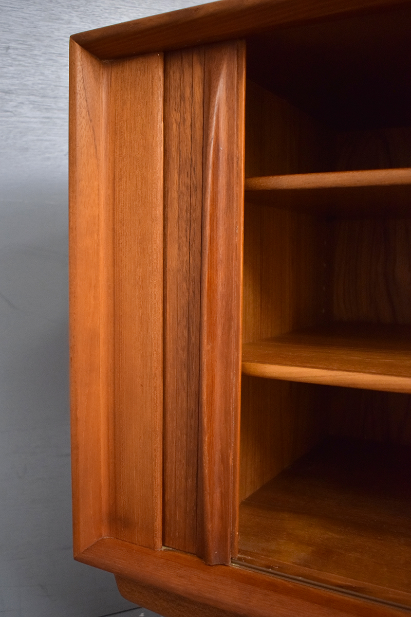 The sideboard sits neatly on tapering solid teak legs, providing the sideboard a light and floating appearance.