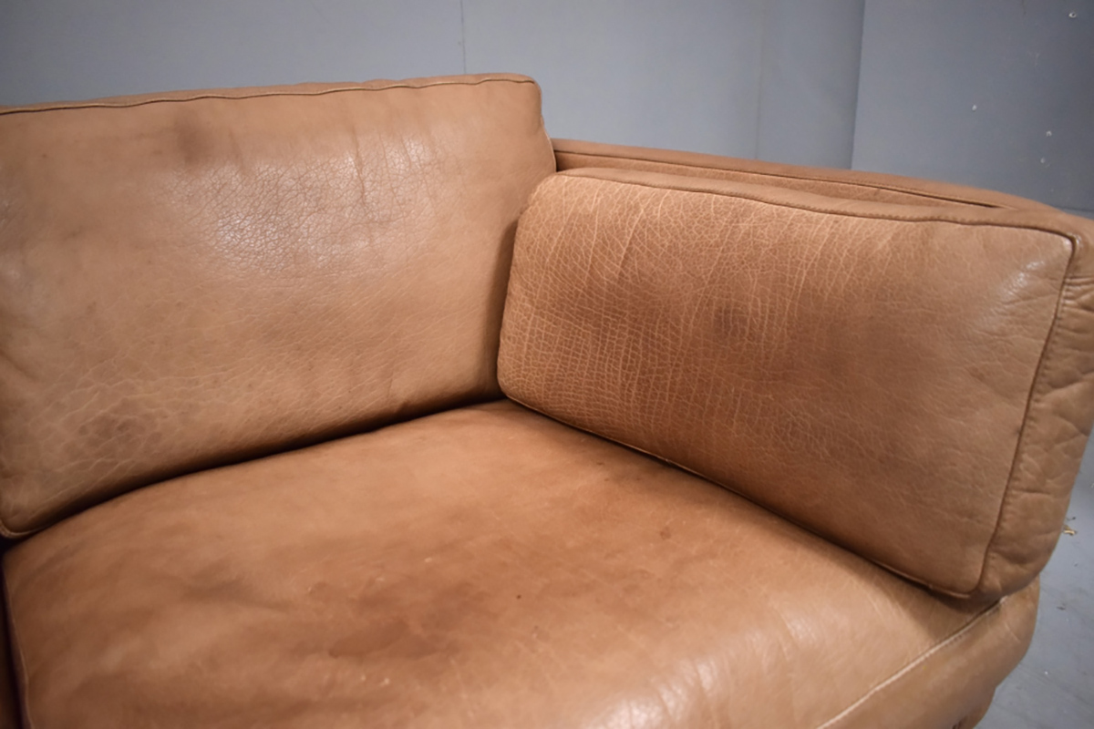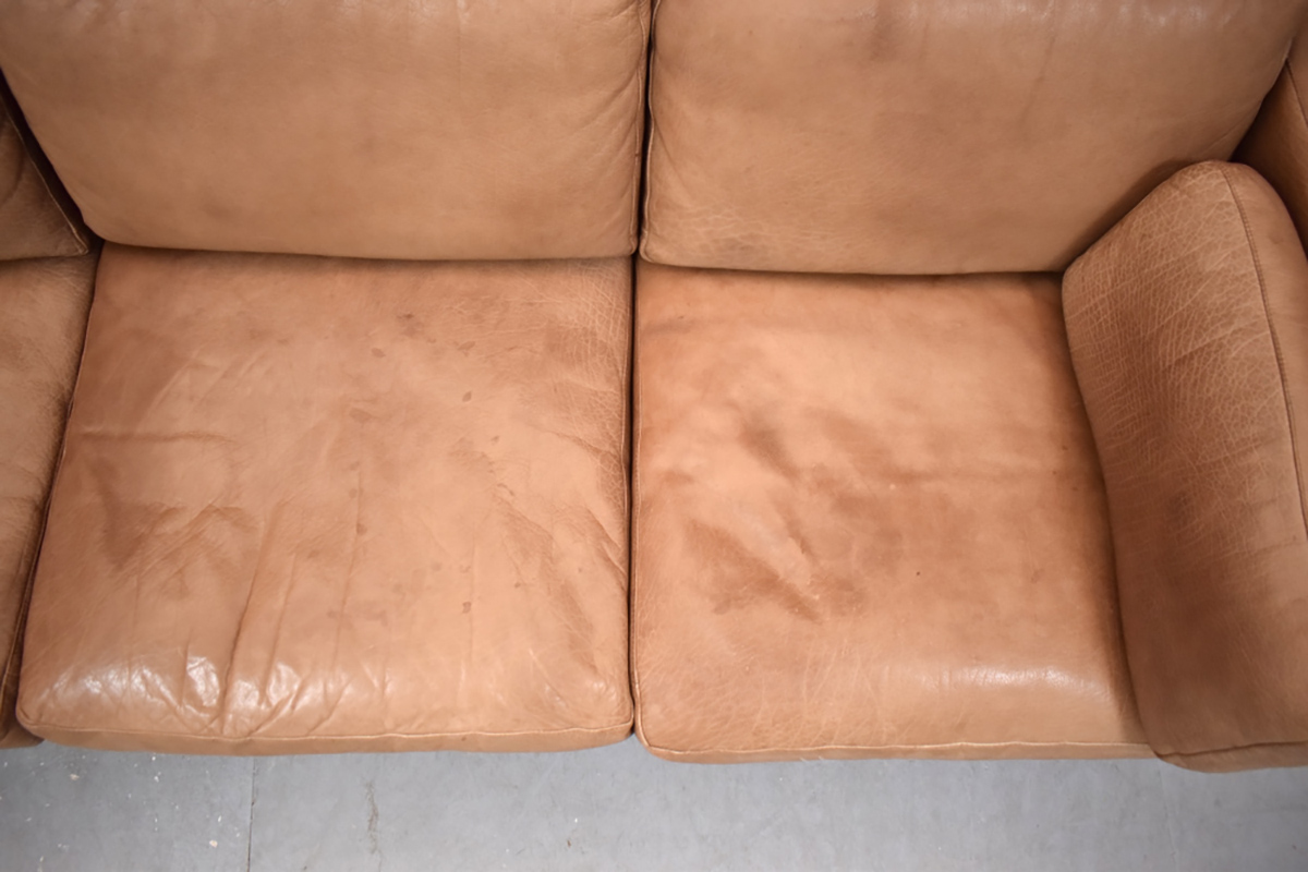 The sofa cushions and frame are all upholstered in the original buffalo leather which has aged and is showing signs of use.