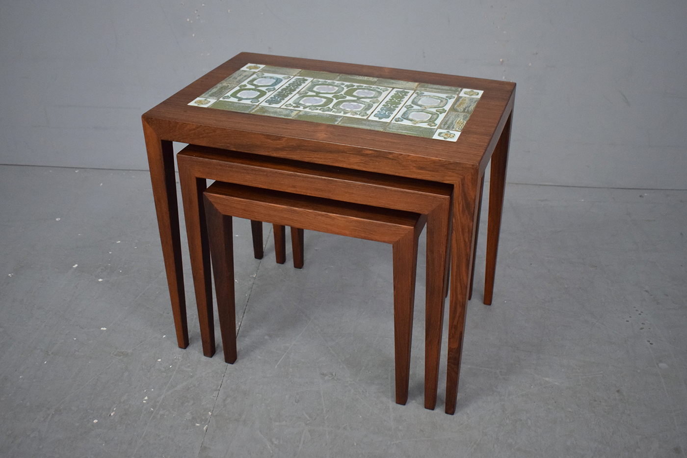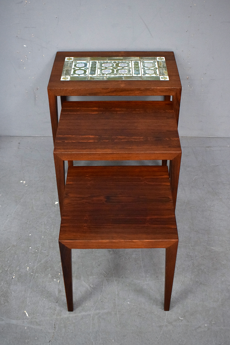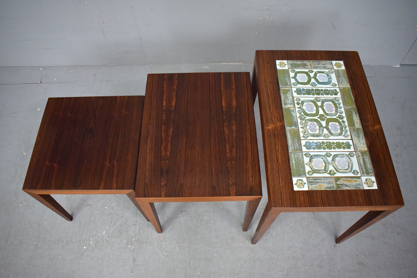 Stunning nest of 3 rosewood side tables designed by Severin Hansen with tiles from ceramicist Nils Thorsson, tables produced by Haslev and tiles by Royal Copenhagen - Model 34A.