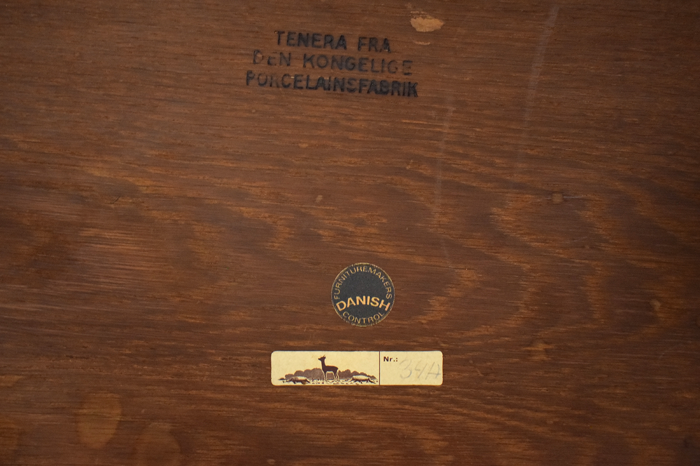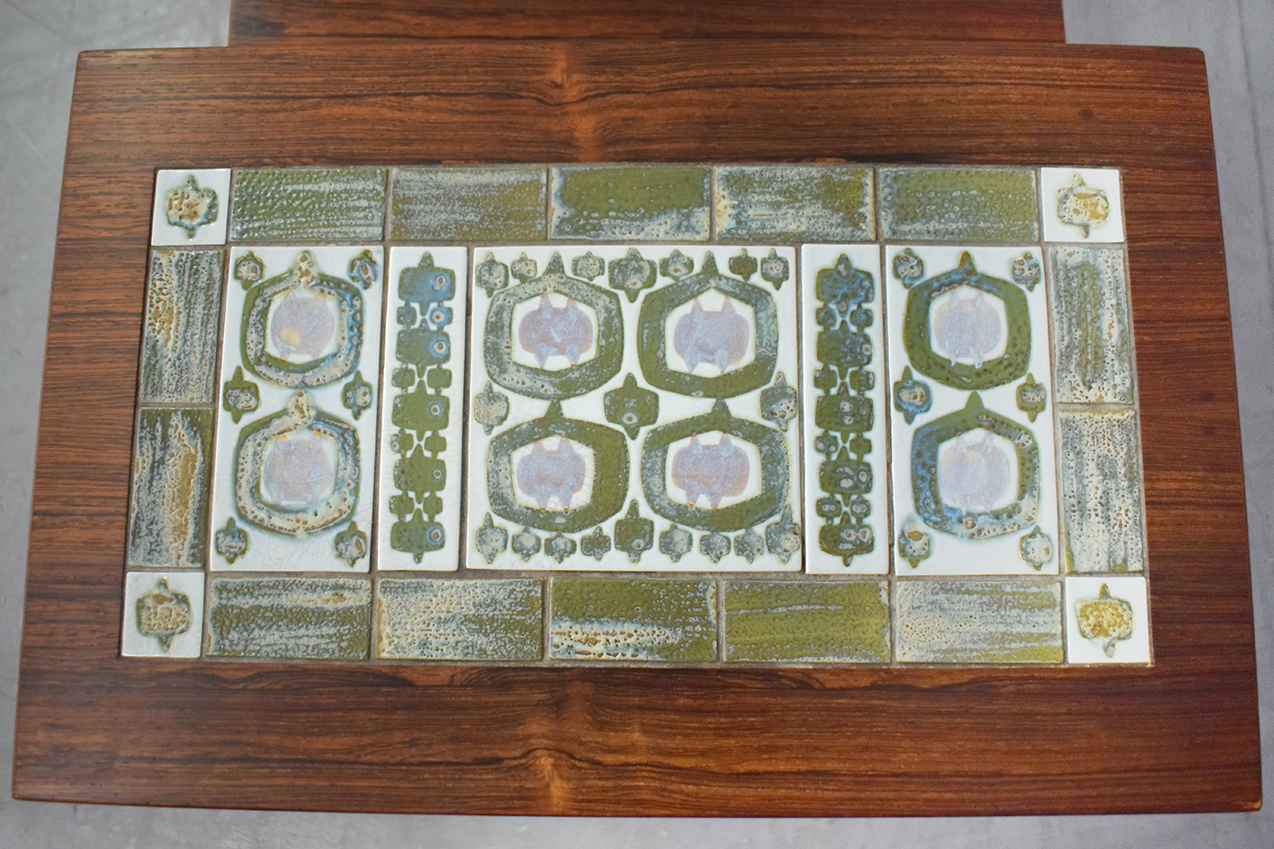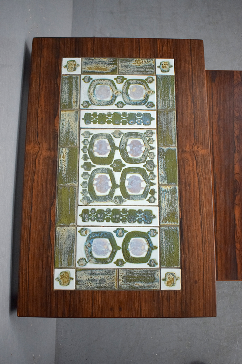 The tables were produced in collaboration with Royal Copenhagen, the largest table featuring 'Tenera' tiles designed by Nils Thorsson. The cream and green colours throughout the tiles make a vibrant contrast to the deep, rich tones of the Zirecote rosewood construction. The use of tiles was an idea by Thorsson as a bridge between the distinguished ceramics of Royal Copenhagen and fine furniture manufactured by Haslev.