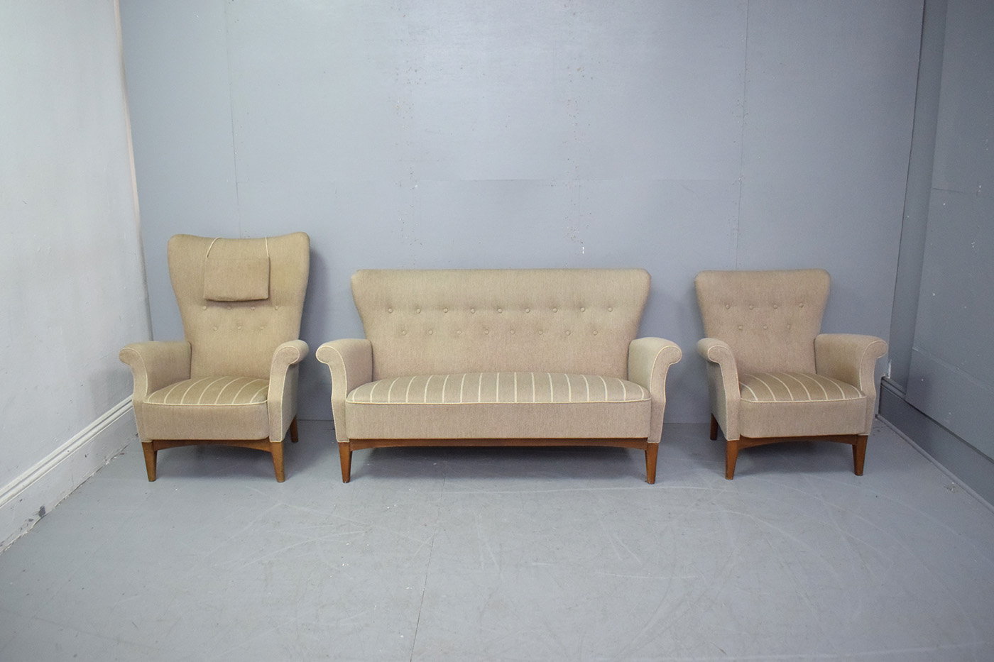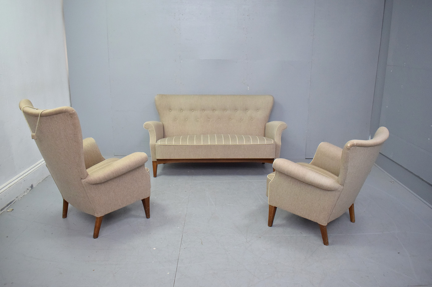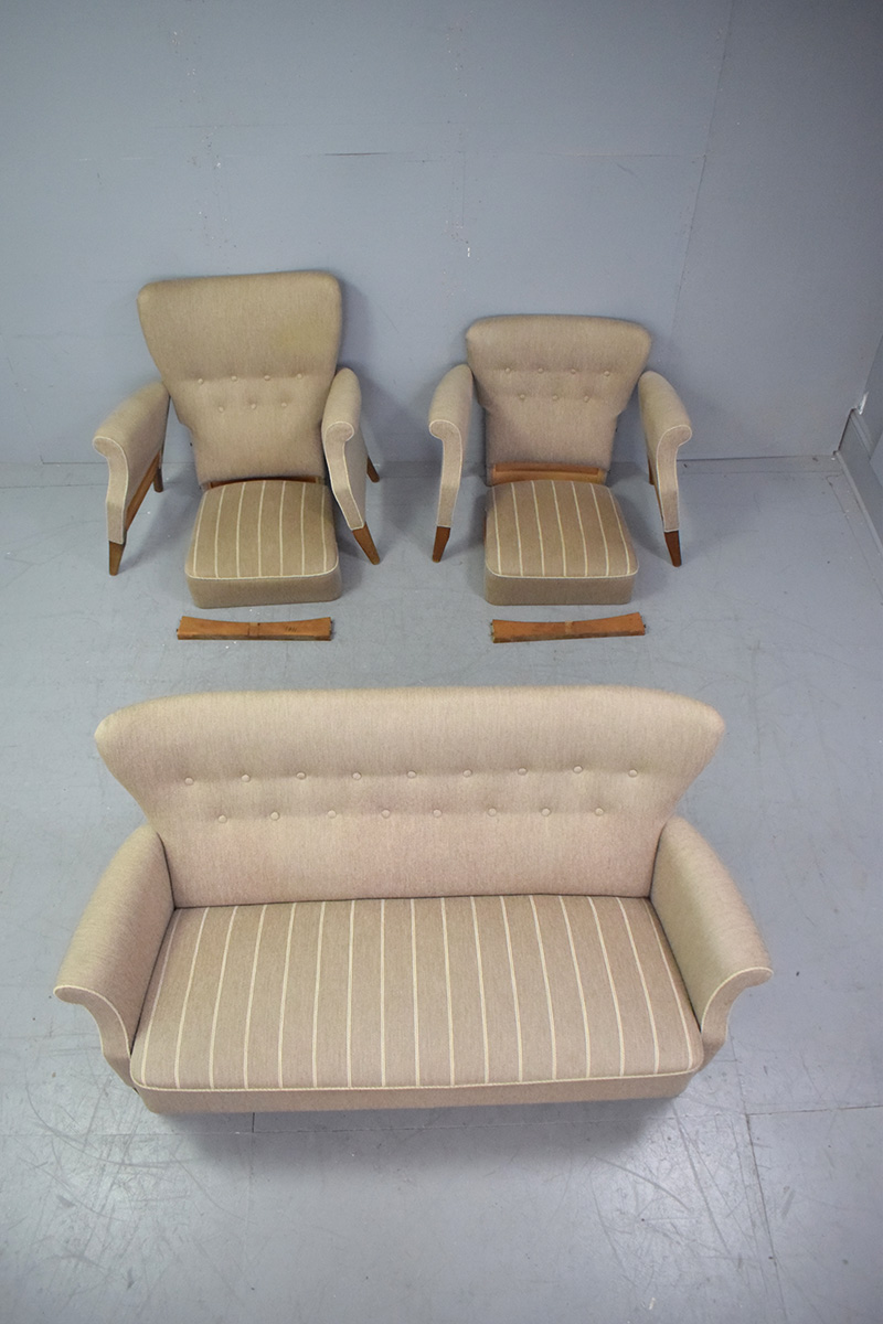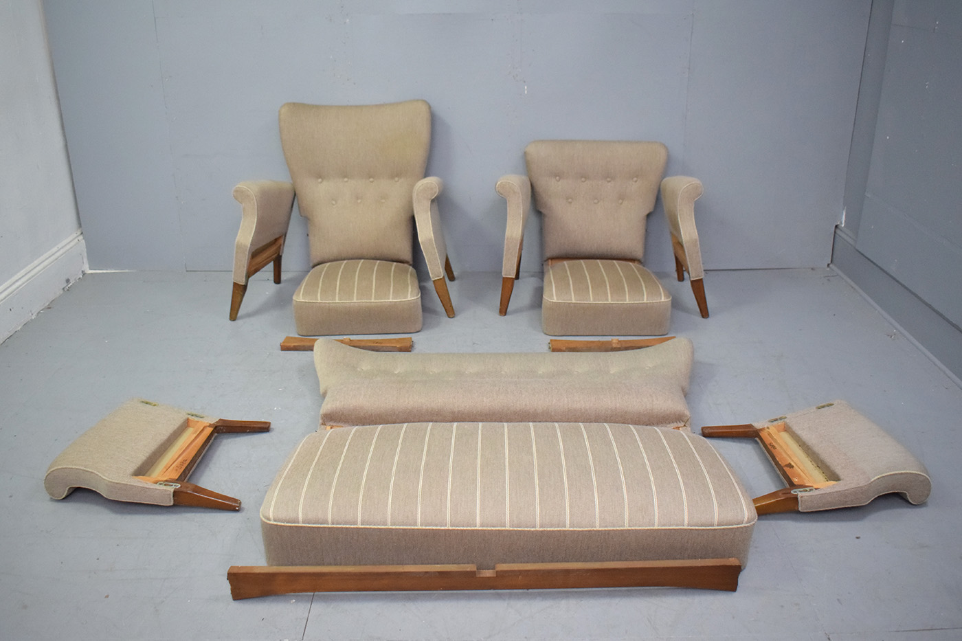 Compact suite comprising 2 seat sofa, high back & low back armchair all with frames that can be dismantled. Designed & Produced by Fritz Hansen in 1940 - serie 8020.
