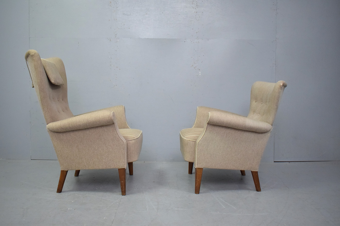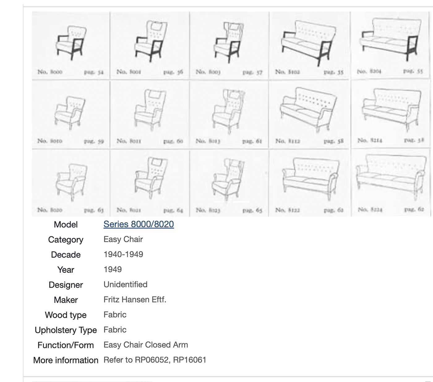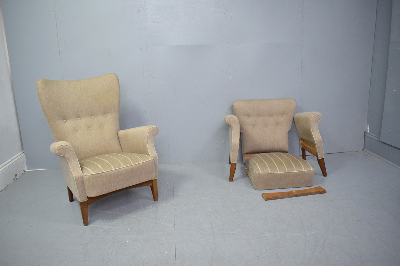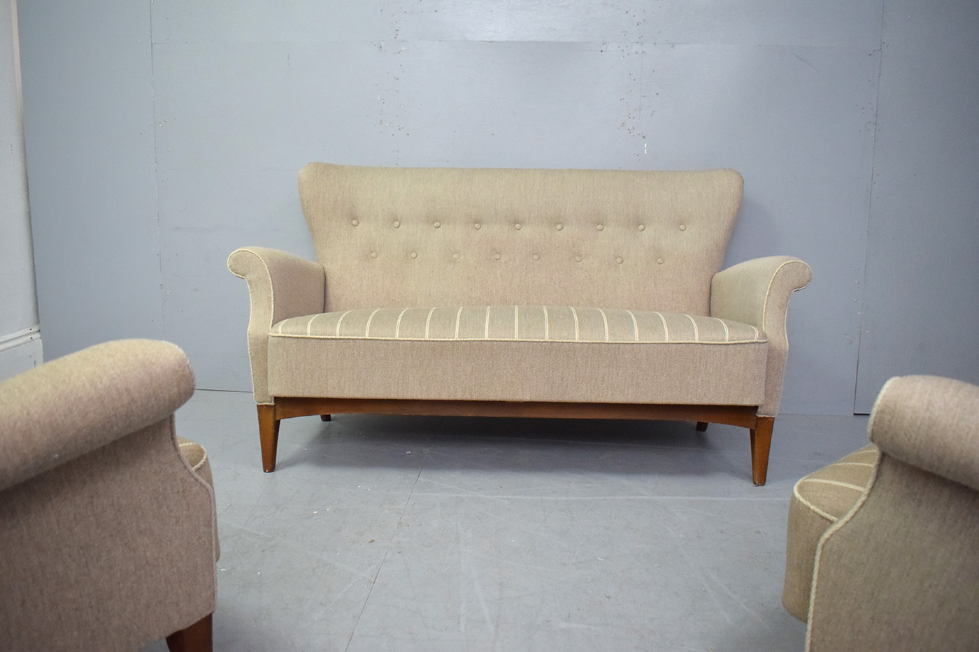 Compact suite comprising 2 seat sofa, high back & low back armchair all with frames that can be dismantled. Designed & Produced by Fritz Hansen in 1940 - serie 8020.